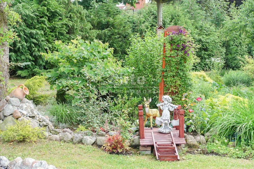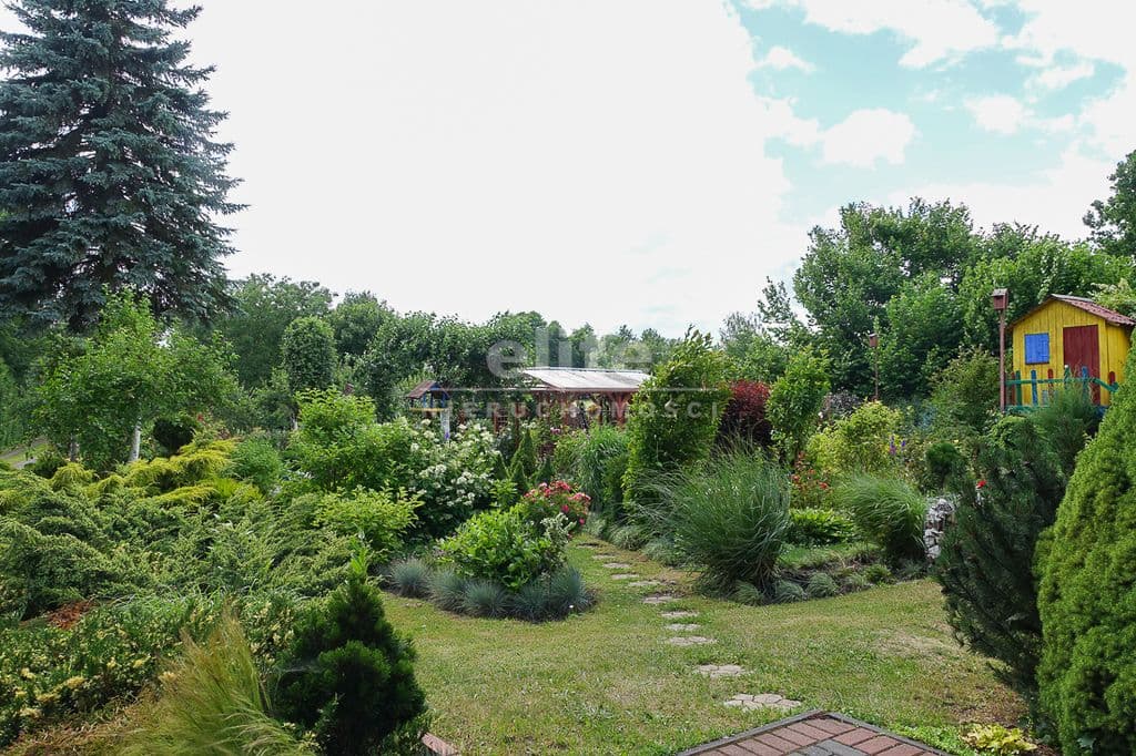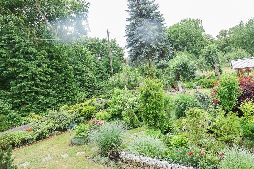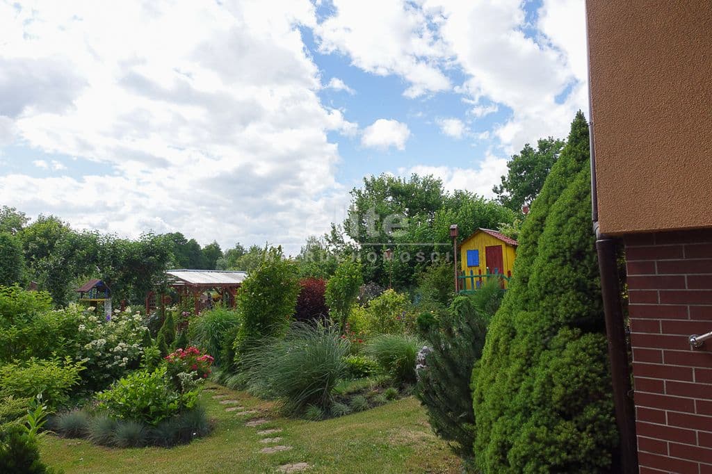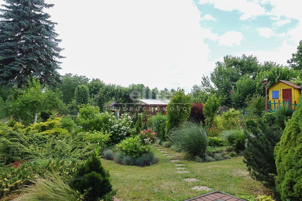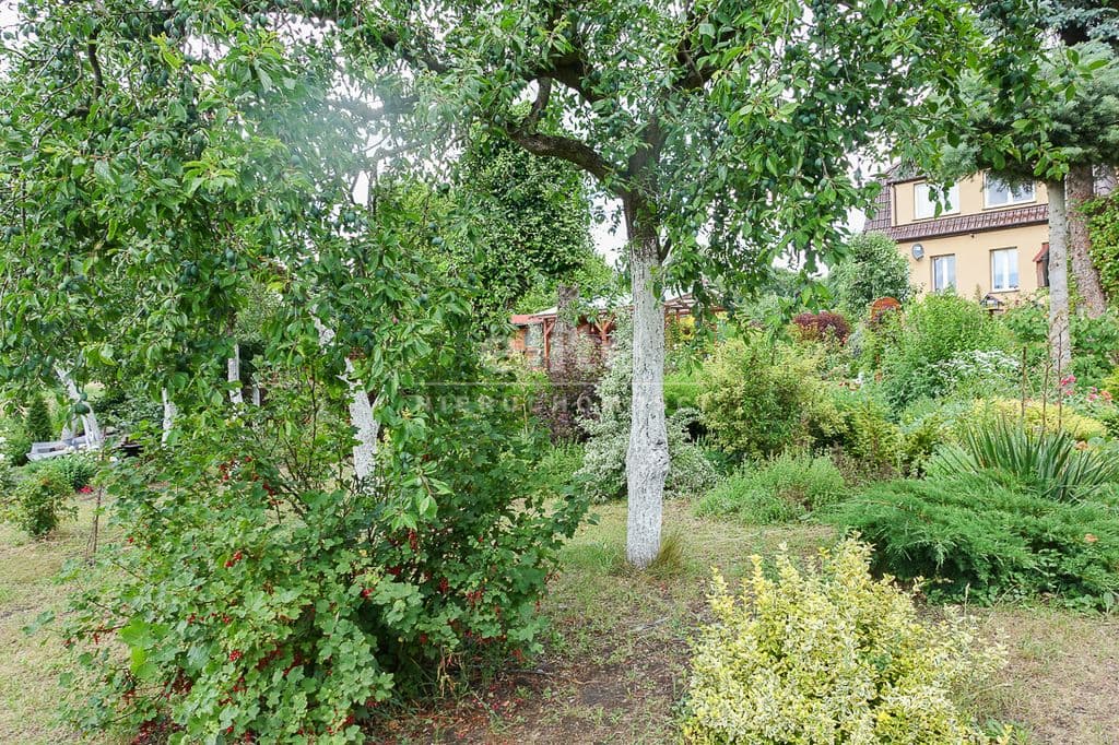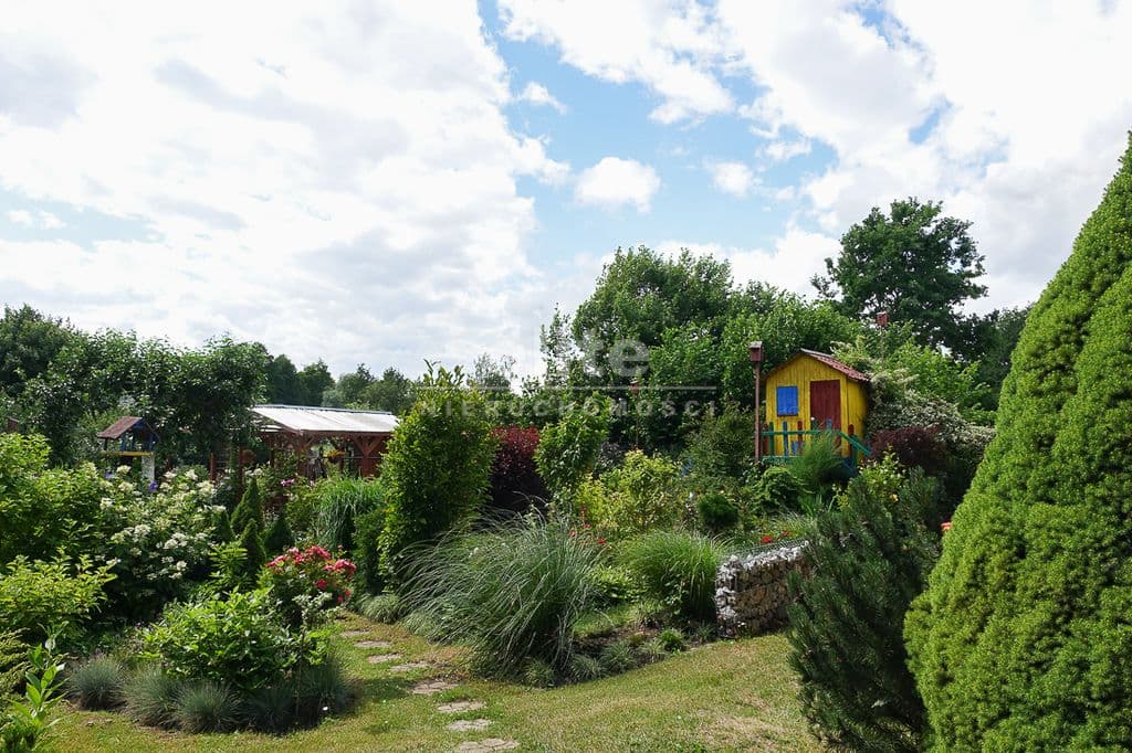 OPIS TERENU: działka 3340 m2, możliwość postawienia drugiego domu, ponadto nowa altana drewniana z tarasem, domek dla dzieci, duża ilość pięknych krzewów i nasadzeń, kwiatów wieloletnich, sad owocowy z jabłoniami, wiśniami, czereśniami, warzywniak, mała fontanna, pomieszczenie gospodarcze, 2 garaże o wysokości 2 m, jeden o powierzchni 12,5 m2, drugi 9 m2 każdy o długości 5 m i wysokości w najniższym punkcie 2 m. Nad garażami zagospodarowany strych.