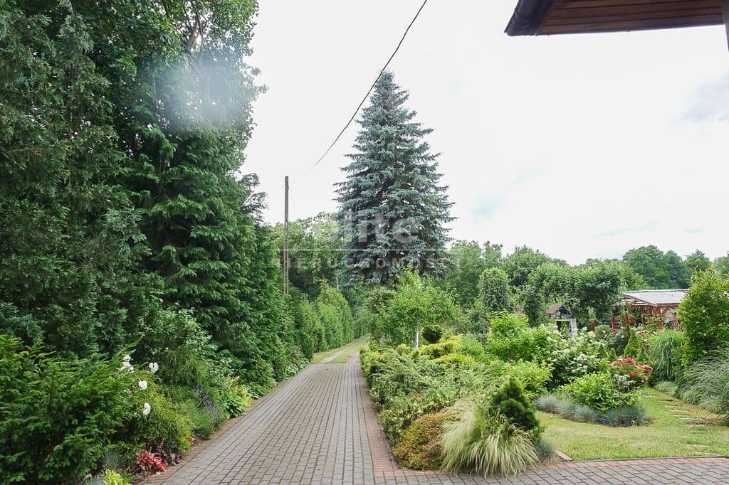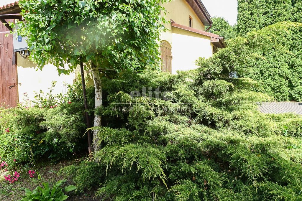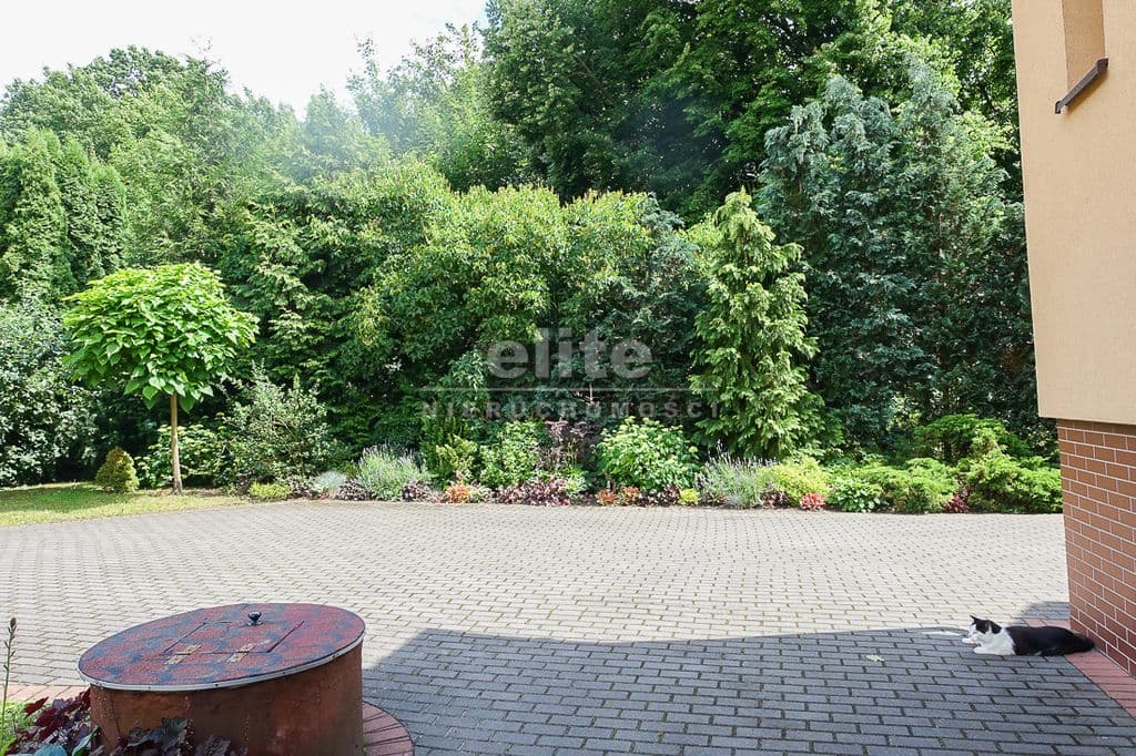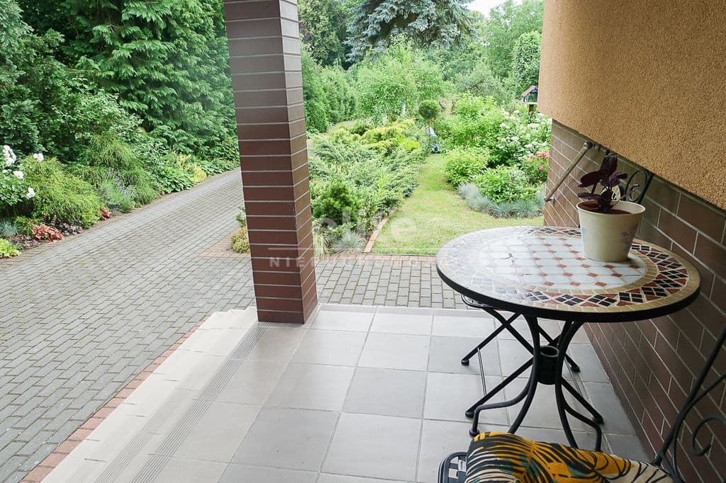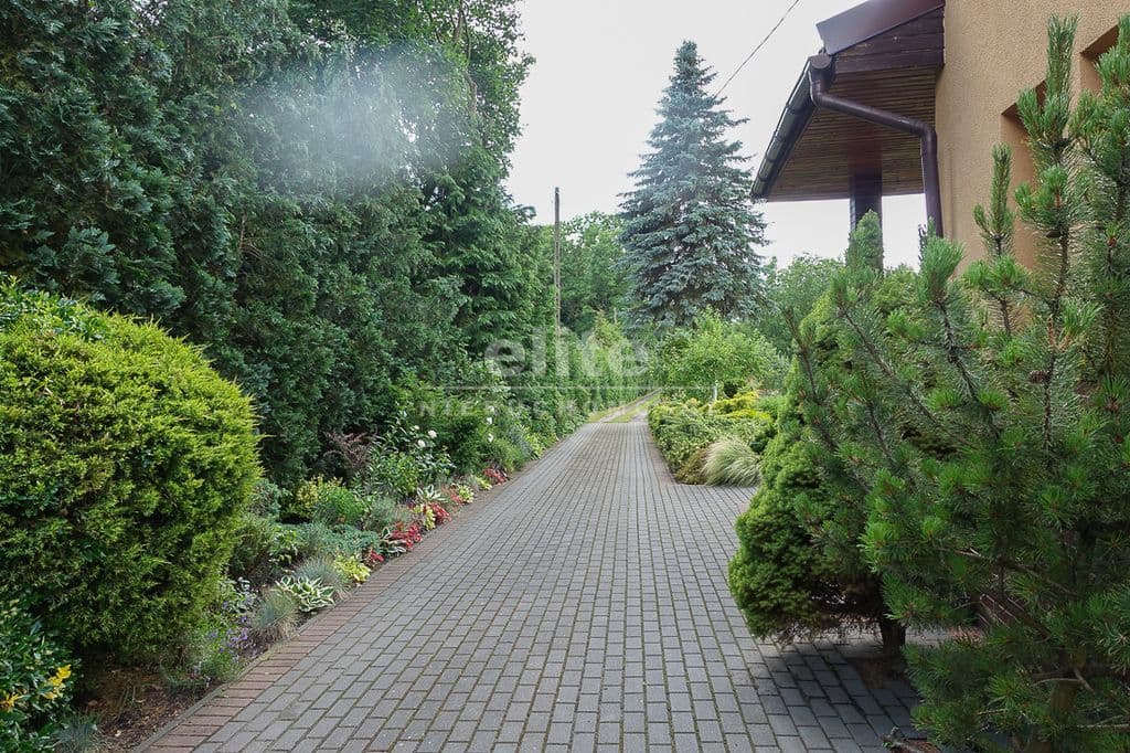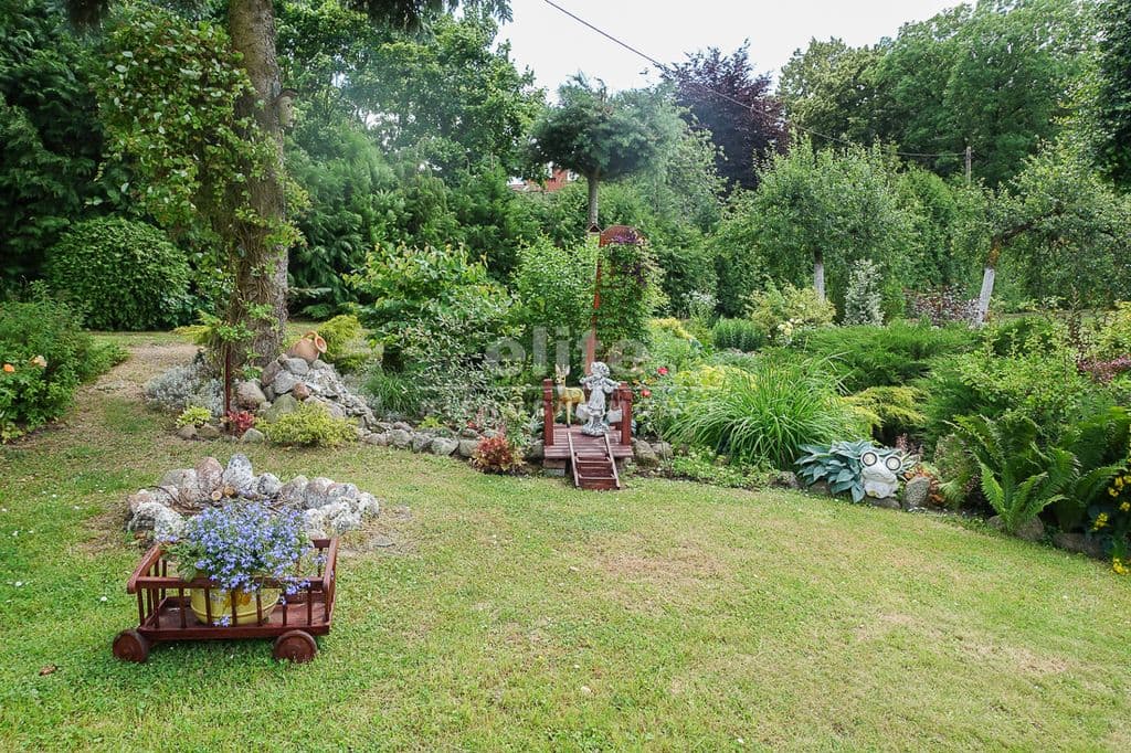 OPIS TERENU: działka 3340 m2, możliwość postawienia drugiego domu, ponadto nowa altana drewniana z tarasem, domek dla dzieci, duża ilość pięknych krzewów i nasadzeń, kwiatów wieloletnich, sad owocowy z jabłoniami, wiśniami, czereśniami, warzywniak, mała fontanna, pomieszczenie gospodarcze, 2 garaże o wysokości 2 m, jeden o powierzchni 12,5 m2, drugi 9 m2 każdy o długości 5 m i wysokości w najniższym punkcie 2 m. Nad garażami zagospodarowany strych.