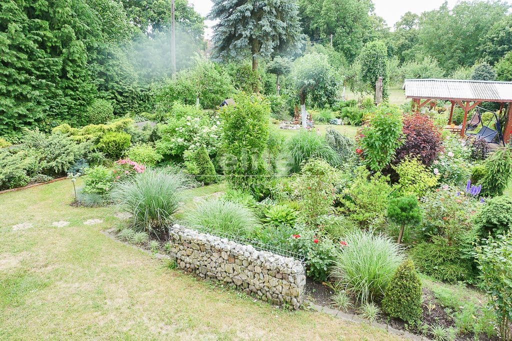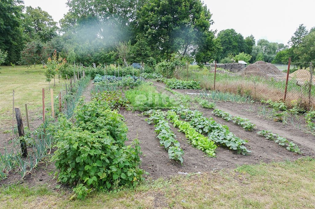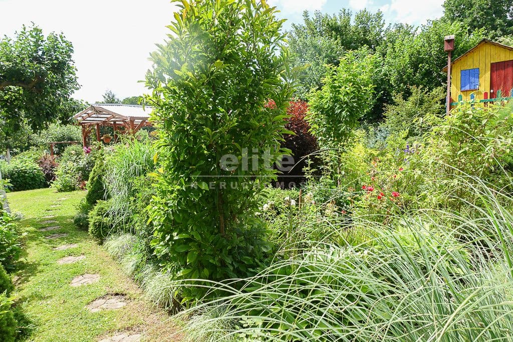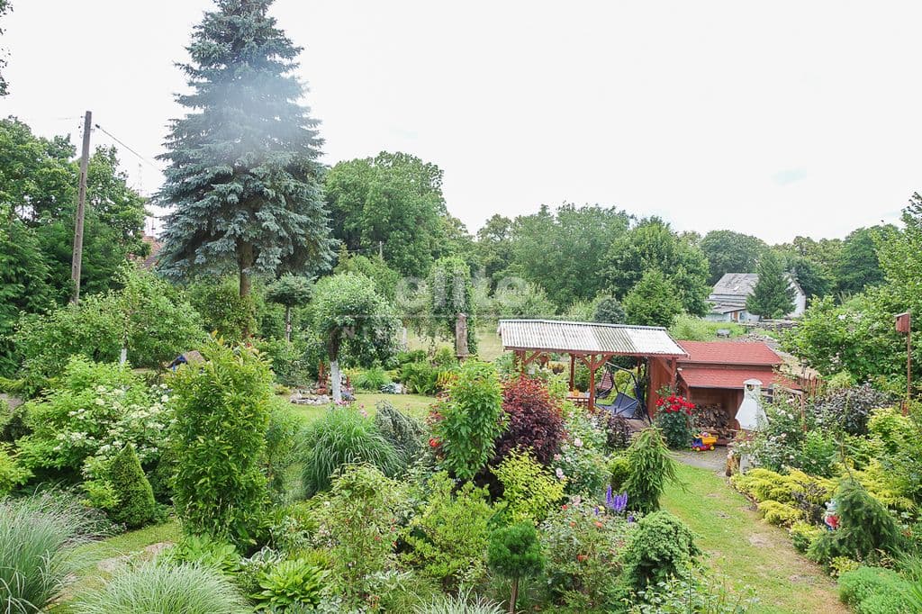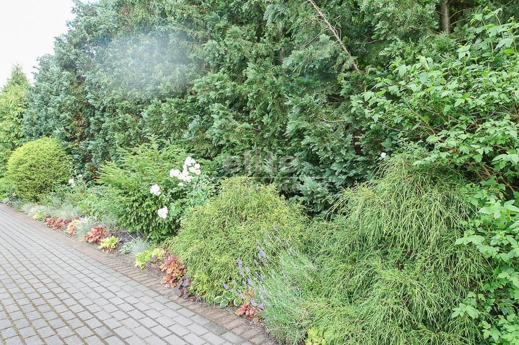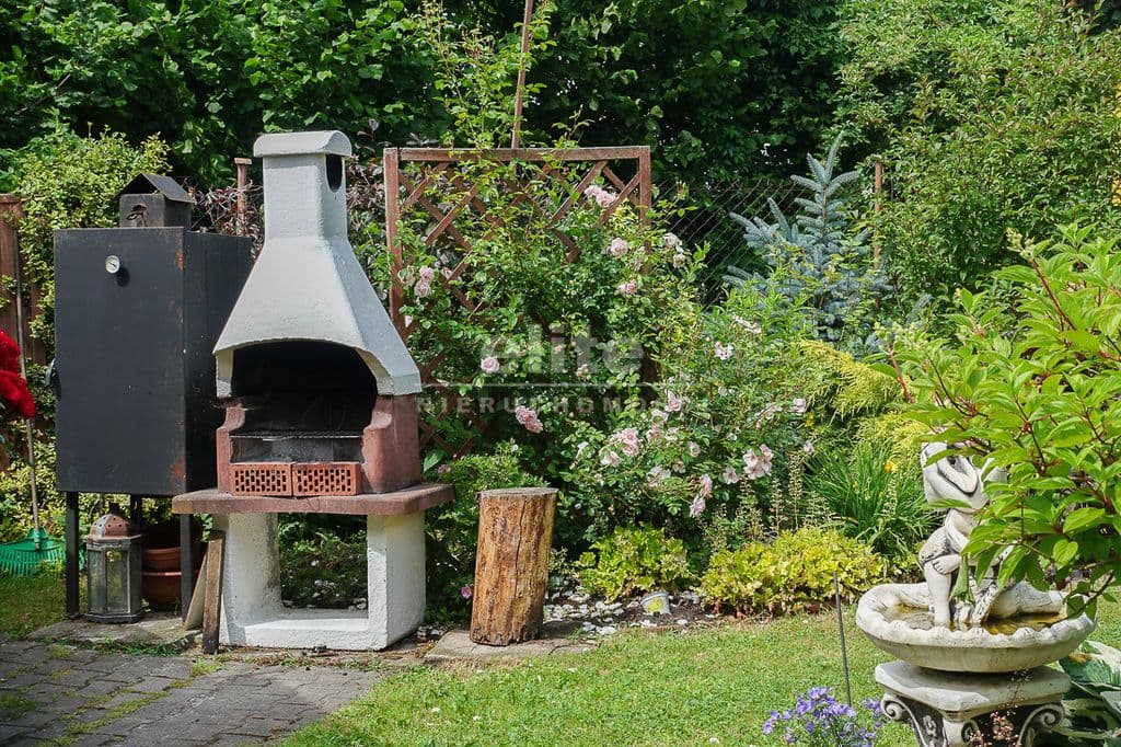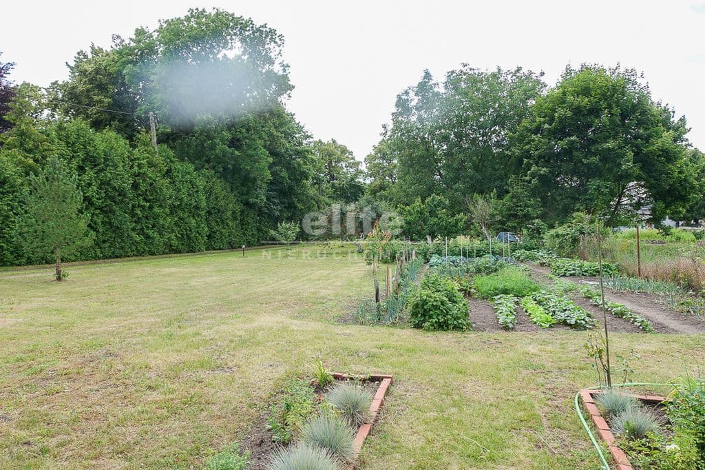 OPIS TERENU: działka 3340 m2, możliwość postawienia drugiego domu, ponadto nowa altana drewniana z tarasem, domek dla dzieci, duża ilość pięknych krzewów i nasadzeń, kwiatów wieloletnich, sad owocowy z jabłoniami, wiśniami, czereśniami, warzywniak, mała fontanna, pomieszczenie gospodarcze, 2 garaże o wysokości 2 m, jeden o powierzchni 12,5 m2, drugi 9 m2 każdy o długości 5 m i wysokości w najniższym punkcie 2 m. Nad garażami zagospodarowany strych.