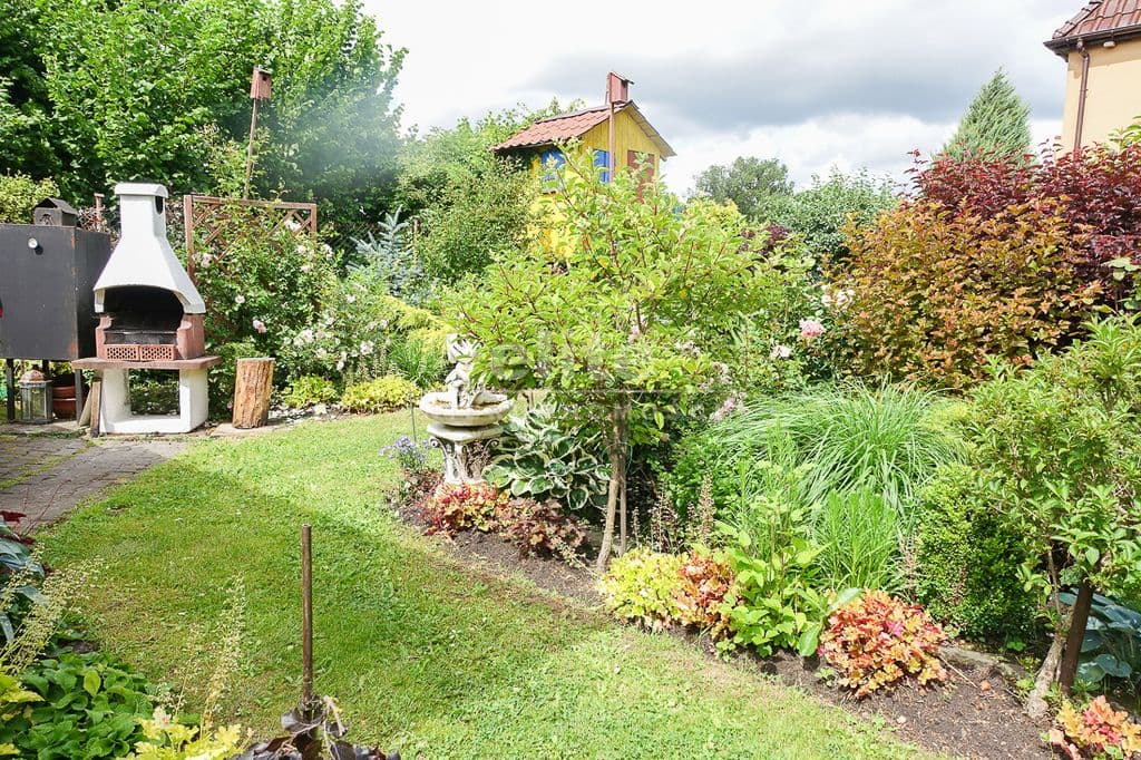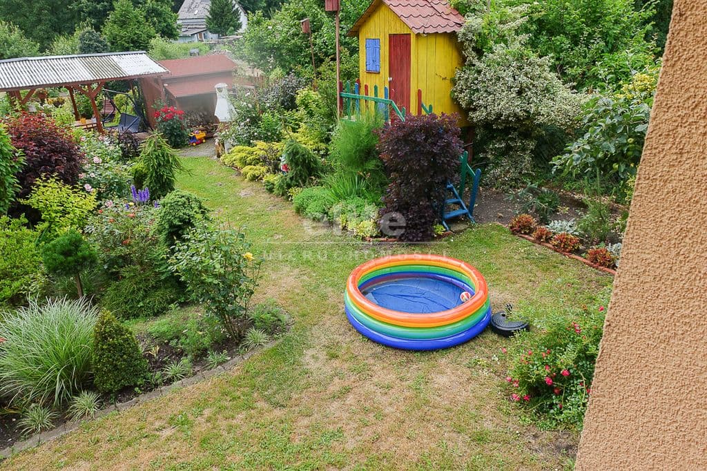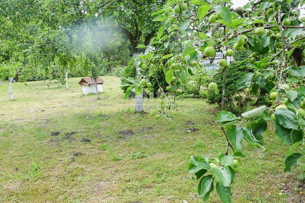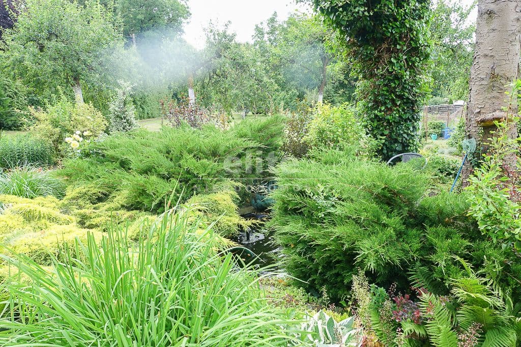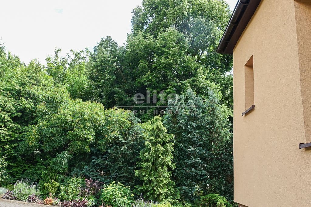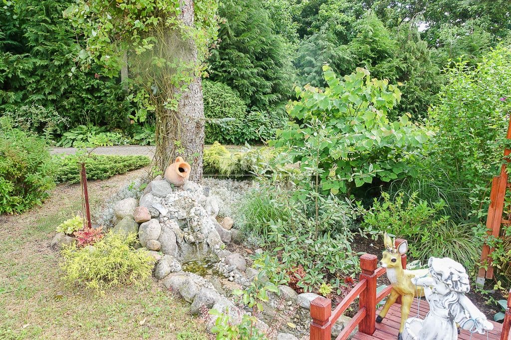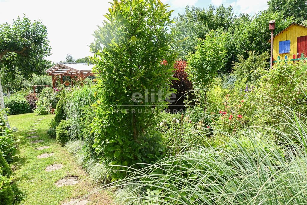 OPIS TERENU: działka 3340 m2, możliwość postawienia drugiego domu, ponadto nowa altana drewniana z tarasem, domek dla dzieci, duża ilość pięknych krzewów i nasadzeń, kwiatów wieloletnich, sad owocowy z jabłoniami, wiśniami, czereśniami, warzywniak, mała fontanna, pomieszczenie gospodarcze, 2 garaże o wysokości 2 m, jeden o powierzchni 12,5 m2, drugi 9 m2 każdy o długości 5 m i wysokości w najniższym punkcie 2 m. Nad garażami zagospodarowany strych.