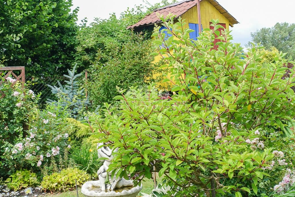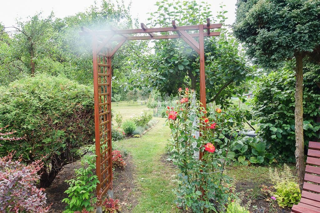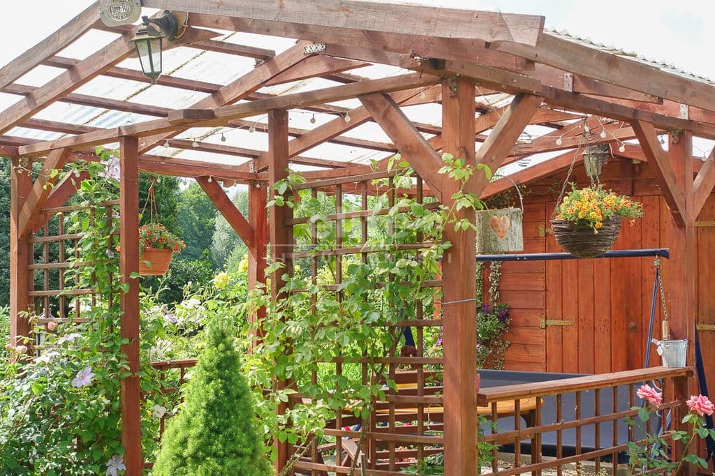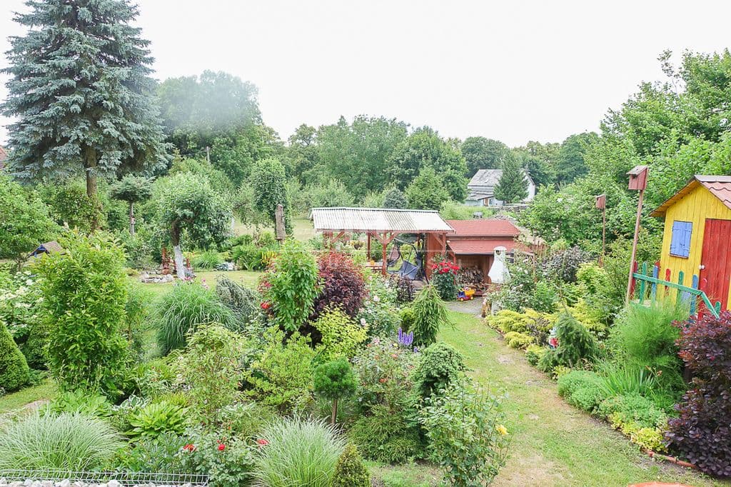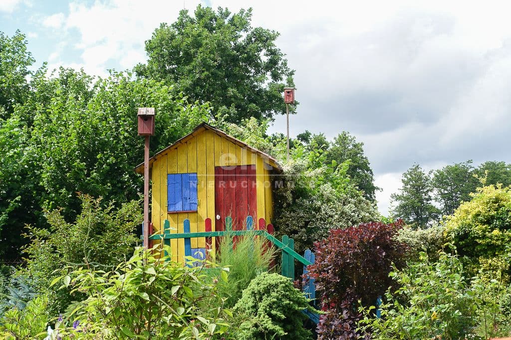 W ogrodzie drewniana altana i domek dla dzieci.