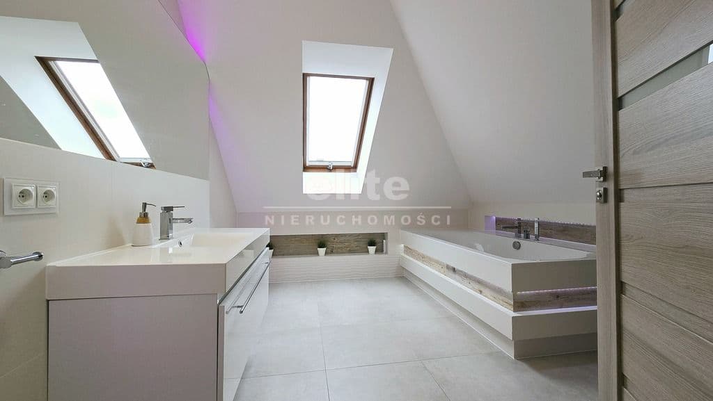 kominek, zmiękczacz wody, centralny odkurzacz, wideofon, monitoring, okna PCV w okleinie, brama na pilota. Budynek ocieplony styropianem grafitowym grubości 20 cm, dach wyłożony dachówką ceramiczną. Zadbany ogród z otwartym tarasem wyłożonym płytami dekoracyjnymi, trawa z rolki, nawadnianie. Ogrodzenie panelowe, podjazd wyłożony kostką, liczne nasadzenia, opaski z kamieni.