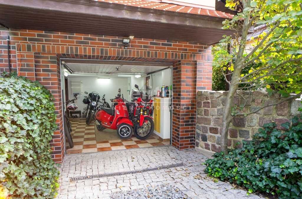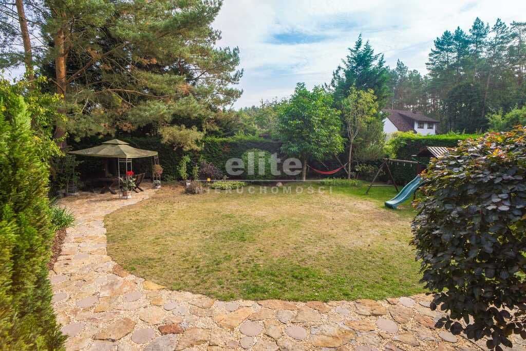 Całość nieruchomości ogrodzona z automatycznymi bramami wjazdowymi i wydzielonym miejscem do wypoczynku w ogrodzie.