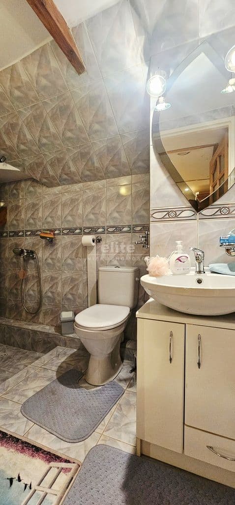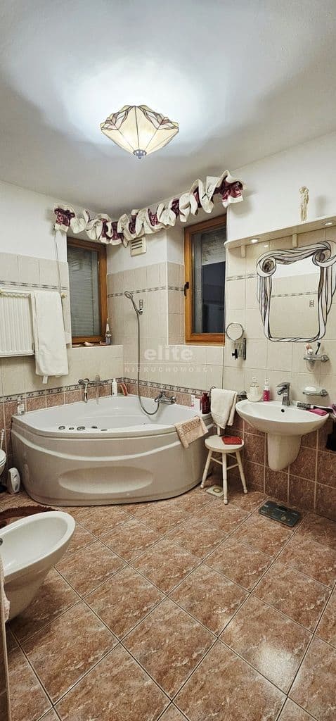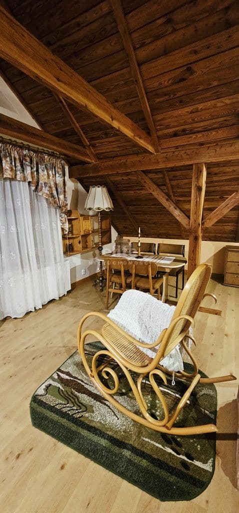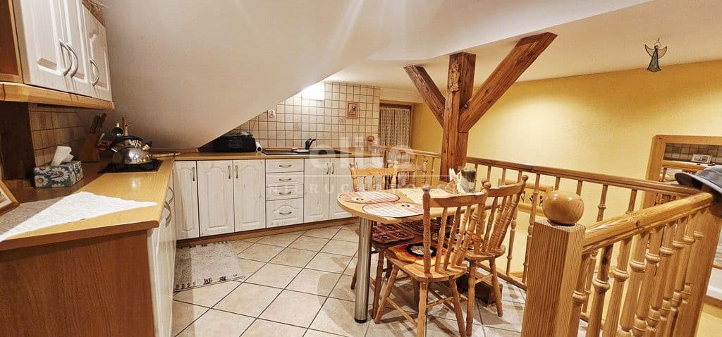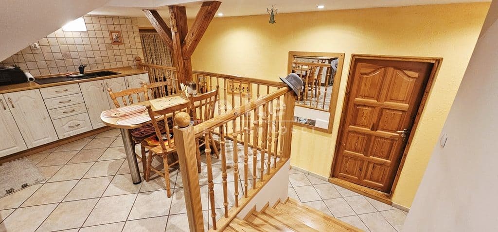 Na piętrze (piętro może stanowić oddzielne mieszkanie) znajdują się dwa bardzo przestronne pokoje, kuchnia oraz dwie łazienki z WC.