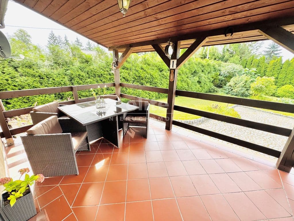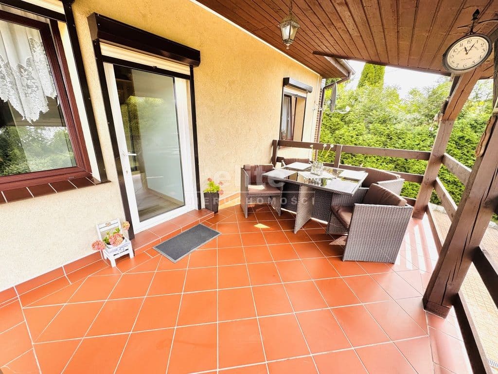 Nieruchomość zawiera dwa tarasy: dolny (ok. 35 m2) oraz górny (zadaszony ok. 14 m2).