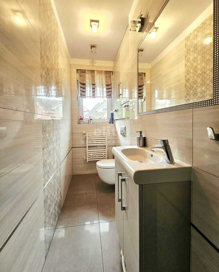 W najbliższym otoczeniu jedynie zabudowa niska, wolnostojąca i jednorodzinna. Na powierzchnię parteru budynku (ok. 130 m²), pełniącego jednocześnie rolę strefy dziennej domu, składają się: otwarta, jasna kuchnia, przestronny salon połączony z jadalnia (z którego wychodzi się na taras oraz pięknie zaaranżowany ogród), łazienka z wc, pomieszczenie sanitarno - gospodarcze, pomieszczenie wielofunkcyjne (obecnie zaaranżowane na gabinet, pracownię oraz łazienkę z WC), korytarz i wiatrołap. Na piętro nieruchomości prowadzą piękne, drewniane schody. W górnej części domu (ok. 90 m²), pełniącej głownie strefę nocną, stanowią 4. sypialnie, garderoba, główna łazienka z pralnią oraz suszarnią, korytarz.