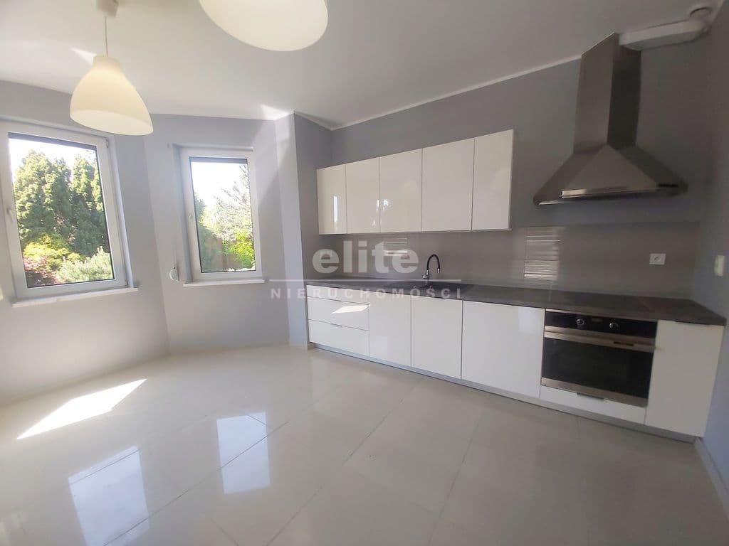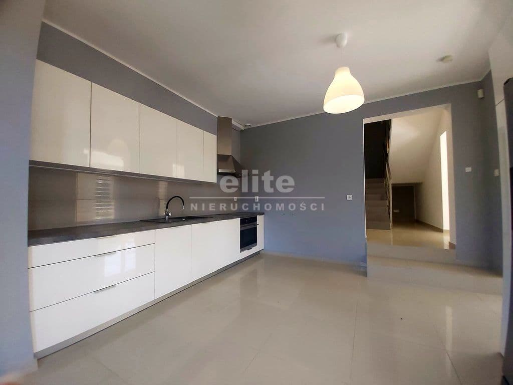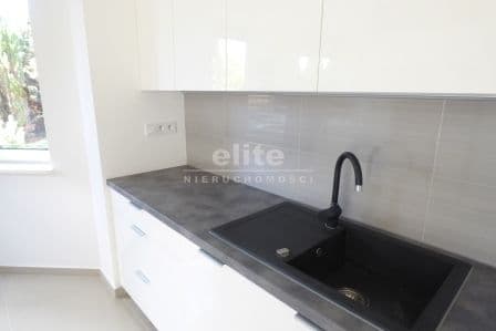 W kuchni – meble MDF wysoki połysk w zabudowie z pełnym wyposażeniem AGD.
