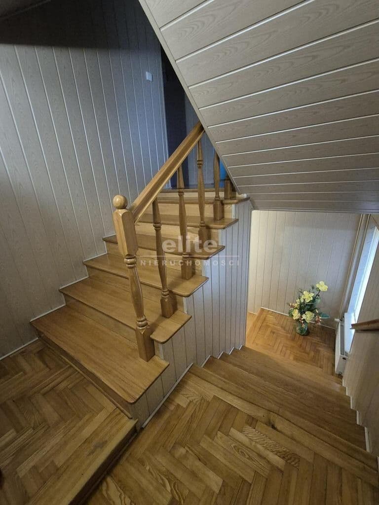 Drewniane schody prowadzą na użytkowe poddasze, na którym znajdują się: