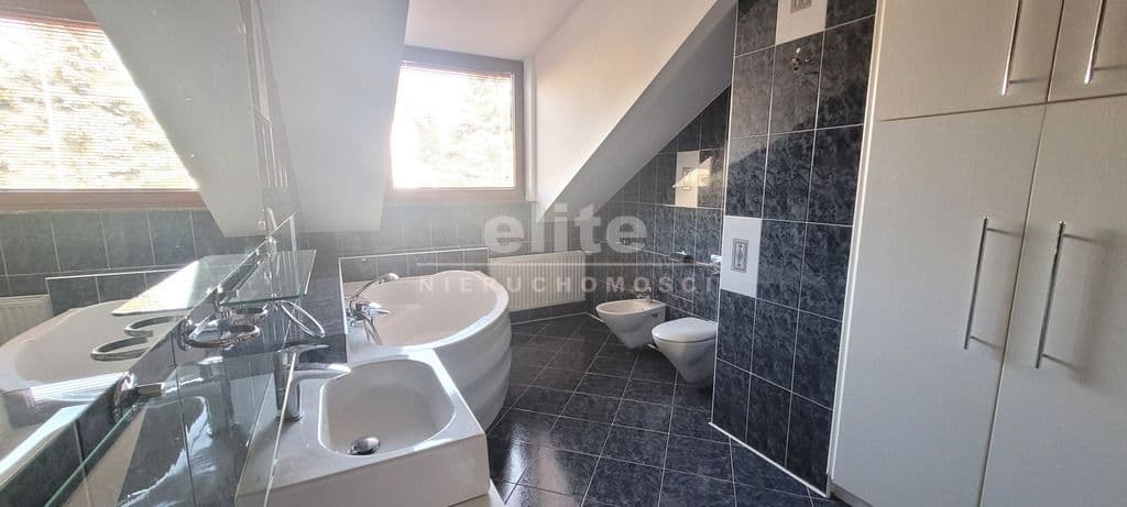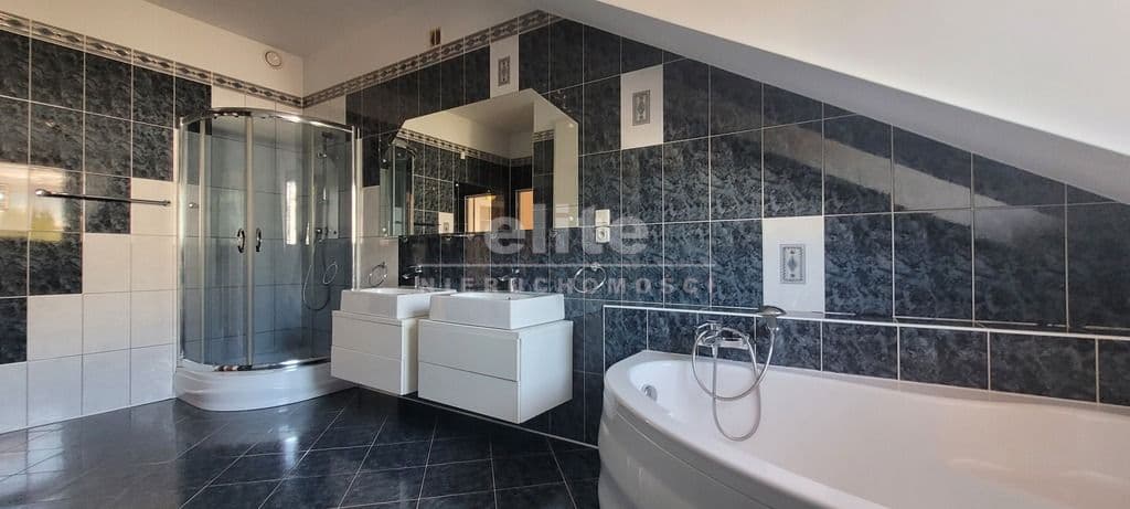 - duża łazienka z oknem (wanna, kabina prysznicowa, dwie umywalki, bidet i wc),
