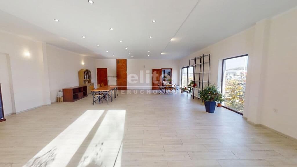 Parter: 125 m2, z czego 93 m2 to 1 duża sala z 3 dużymi oknami, korytarz, wc, kuchnia, kotłownia.