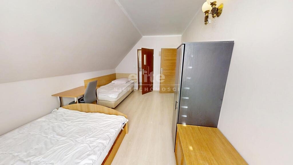 Na poddaszu - 128 m2, hol, 6 osobnych umeblowanych pokoi, każdy z łazienką.