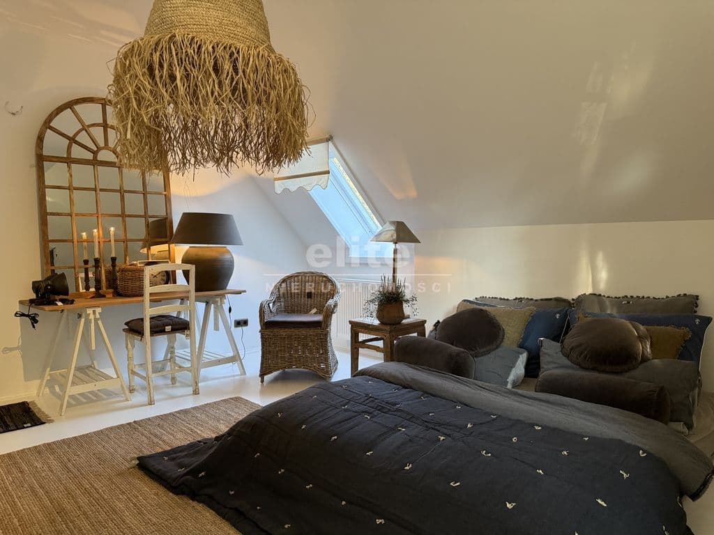 Na I piętrze są dwie duże sypialnie, pokój kąpielowy, przestronna garderoba oraz biuro z biblioteką.