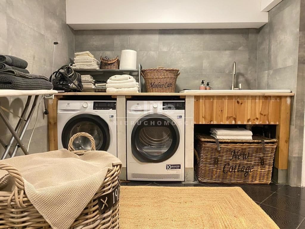 POZIOM -1 to wysokie przyziemie, w którym znajduje się duży, widny pokój, łazienka z kabiną prysznicową, pralnia z wyposażeniem, pomieszczenia gospodarcze i spiżarnia.