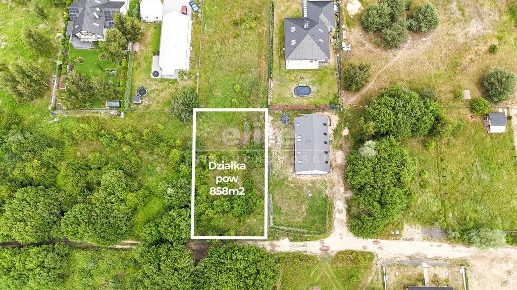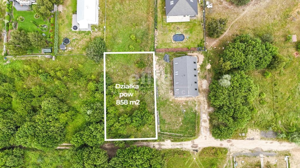 Działka płaska, w kształcie prostokąta, o powierzchni 858 m2.