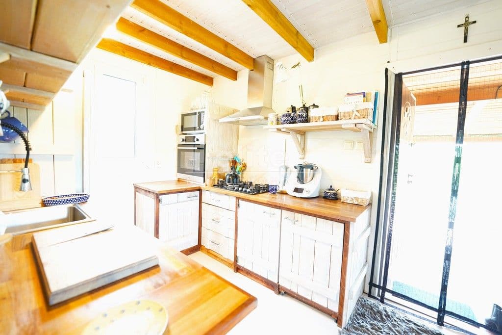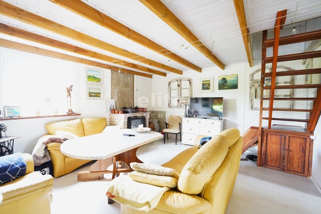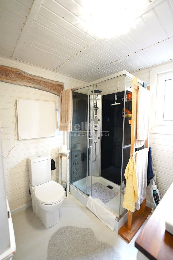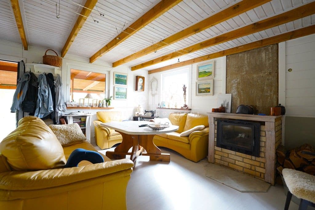 Budynek ogrzewany jest kominkiem zasilanym drewnem.