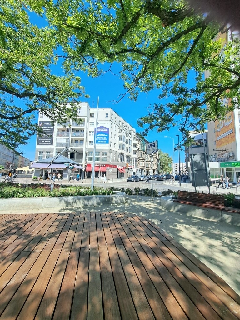 Lokal usytuowany przy placu Zgody przy zjeździe z nowo otwartej alei Wojska Polskiego , która przeszła pełną modernizację i wygląda spektakularnie . Wszędzie są ławeczki i szerokie miejsca spacerowe.