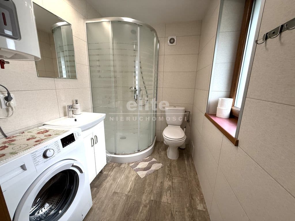 - Łazienka: prysznic, toaleta, umywalka, pralka, bojler elektryczny