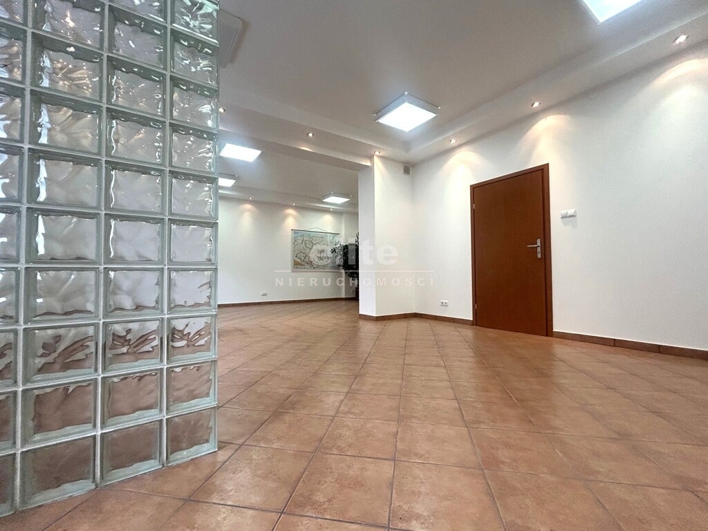 - pomieszczenie biurowe od frontu (pow. 43,90 m2) z wydzielonymi dwoma strefami (pierwsza z wejściem z ulicy, druga z balkonem), na podłodze terakota, okna PCV, rolety zewnętrzne, przegroda ze szklanej cegły przy wejściu