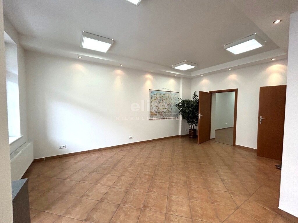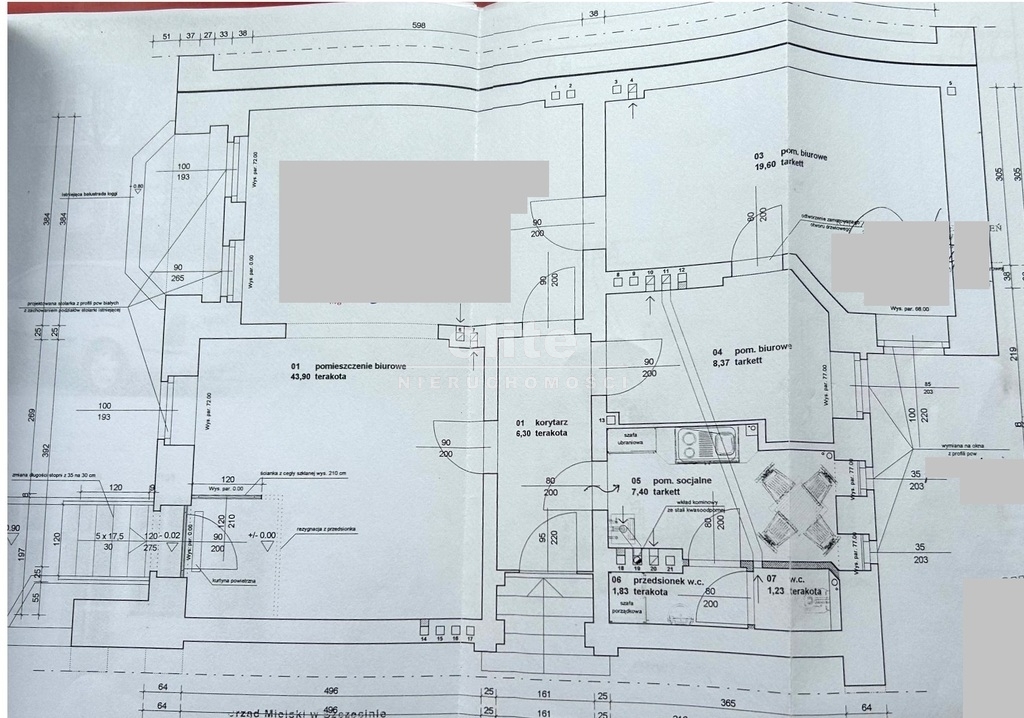 - pomieszczenie biurowe od frontu (pow. 43,90 m2) z wydzielonymi dwoma strefami (pierwsza z wejściem z ulicy, druga z balkonem), na podłodze terakota, okna PCV, rolety zewnętrzne, przegroda ze szklanej cegły przy wejściu