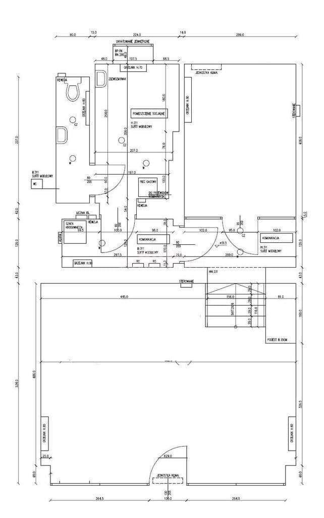 Wysokość sali głównej – 3,5 m, gabinetu i części socjalnej – 3,11 m.