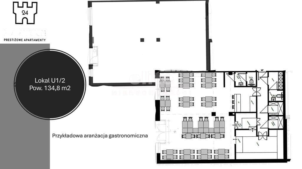 Przemyślany układ pomieszczeń stwarza szerokie możliwości aranżacyjne -zarówno pod kameralną kawiarnię jak i większy lokal restauracyjny.