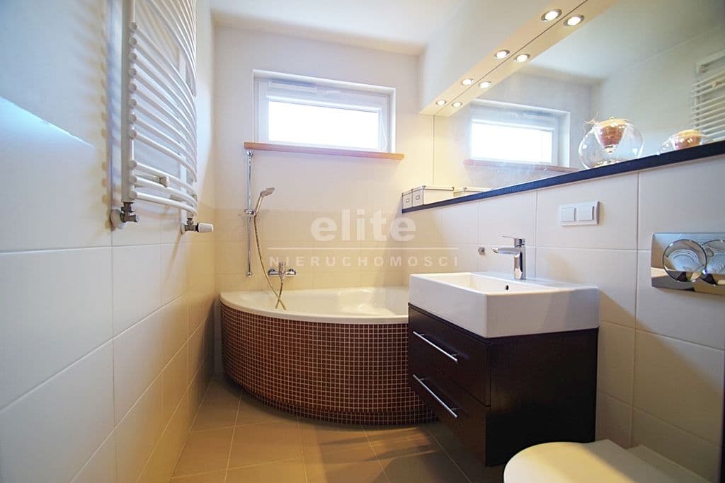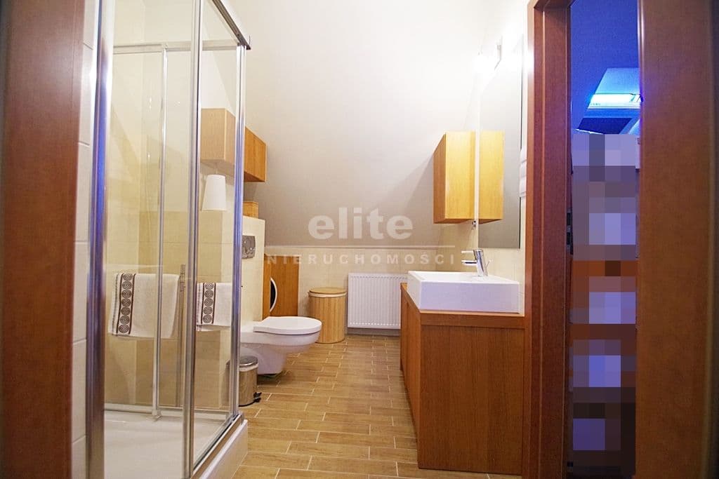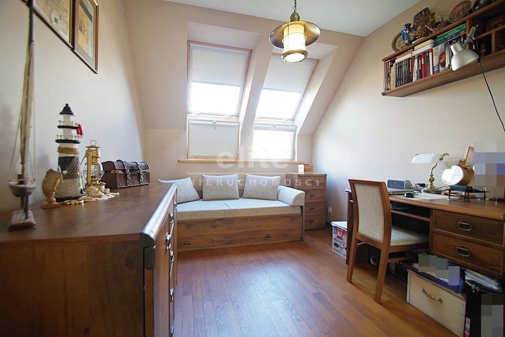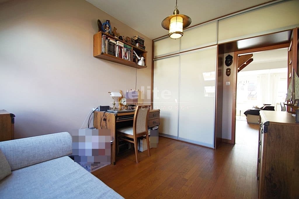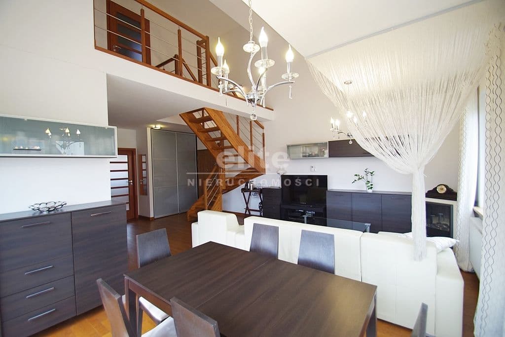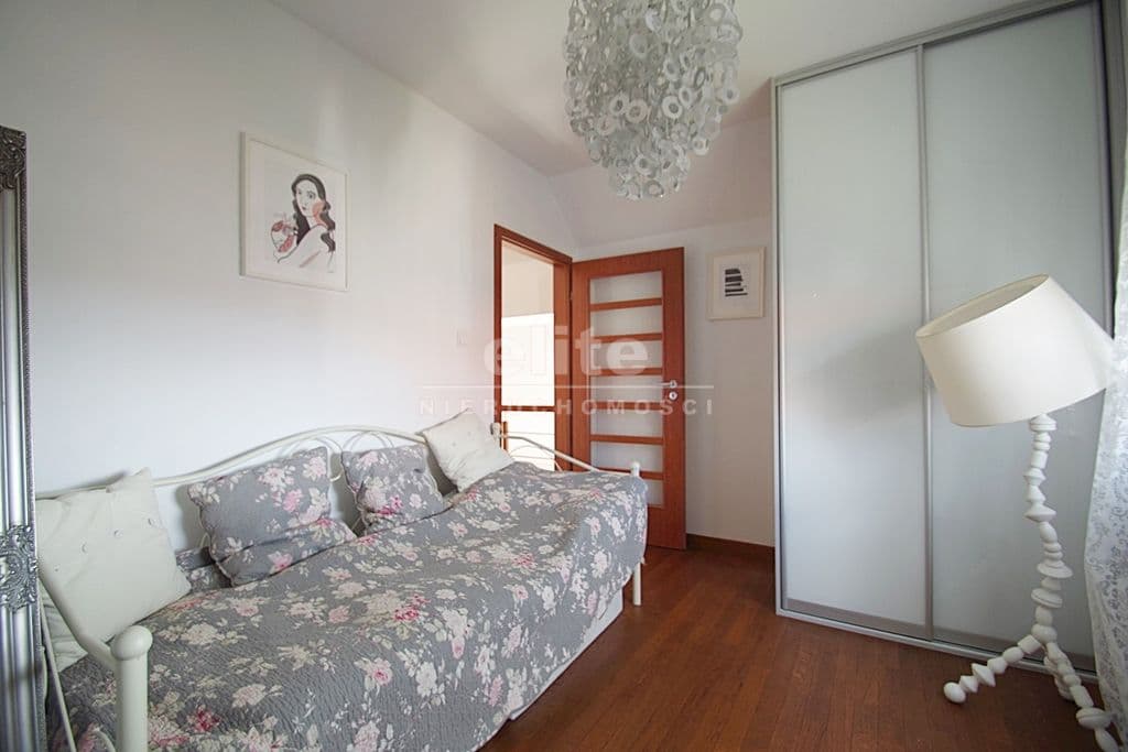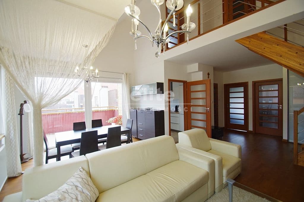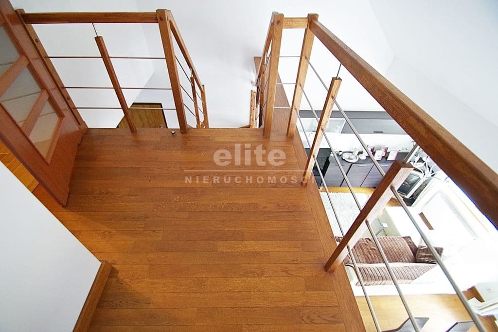 Każda z sypialni wyposażona w szafę w zabudowie stałej. Kuchnia dostępna z salonu, została zamknięta lekką ścianką działową, którą można z powodzeniem usunąć otwierając ją na salon. Łazienka na pierwszym poziomem z oknem, druga na górze jest przejściowa do dużego pomieszczenia gospodarczego z oknem połaciowym. Na piętro prowadzą drewniane ażurowe schody, stanowiące piękny element wyposażenia salonu. Lokal świetnie utrzymany, zadbany bez konieczności odświeżania, wykończony z wysokiej jakości materiałów (na podłogach parkiet dębowy, drewniane drzwi, elektryczna markiza nad tarasem).