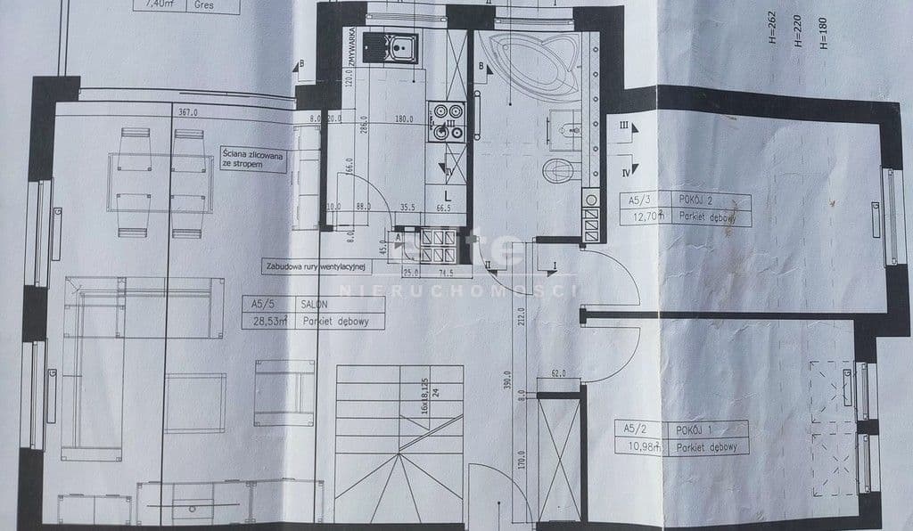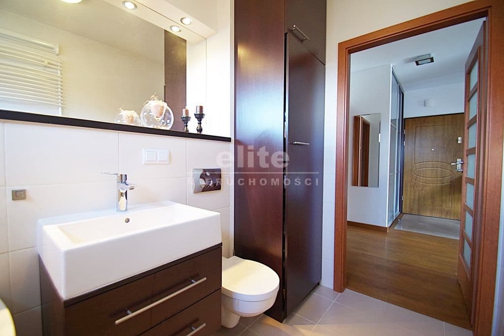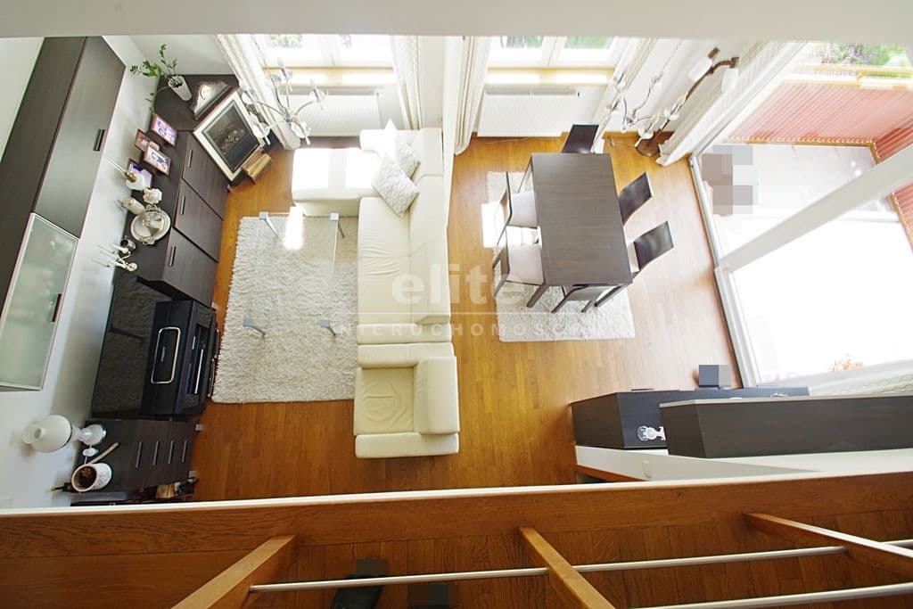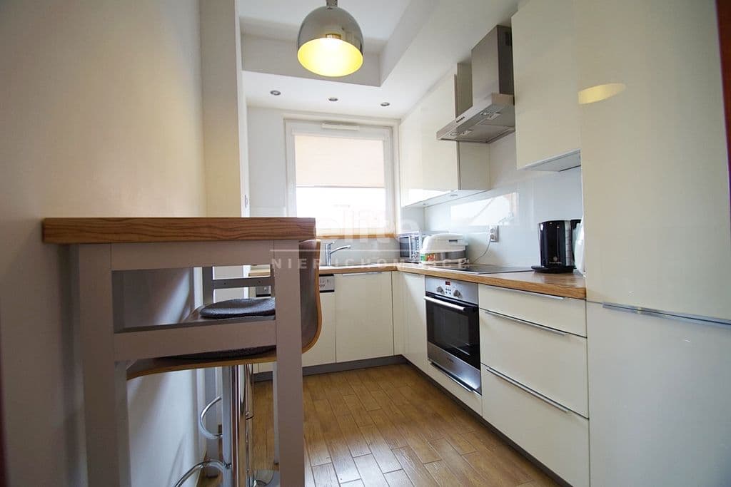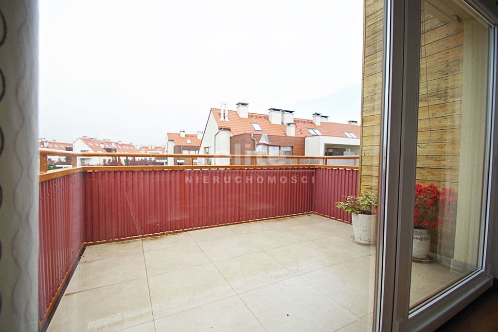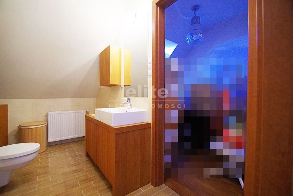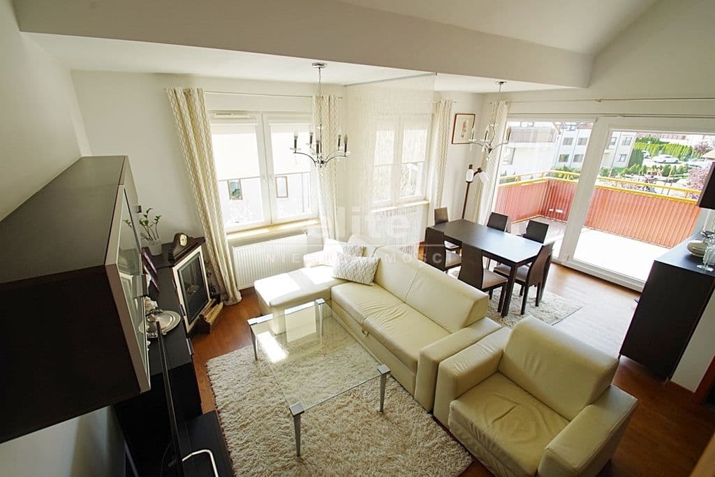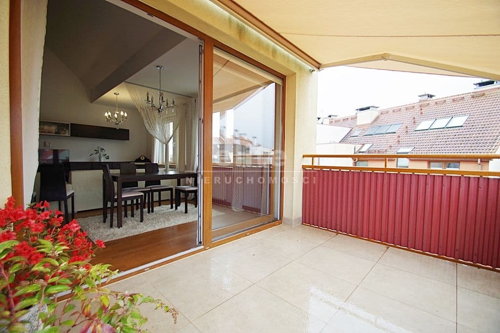 Każda z sypialni wyposażona w szafę w zabudowie stałej. Kuchnia dostępna z salonu, została zamknięta lekką ścianką działową, którą można z powodzeniem usunąć otwierając ją na salon. Łazienka na pierwszym poziomem z oknem, druga na górze jest przejściowa do dużego pomieszczenia gospodarczego z oknem połaciowym. Na piętro prowadzą drewniane ażurowe schody, stanowiące piękny element wyposażenia salonu. Lokal świetnie utrzymany, zadbany bez konieczności odświeżania, wykończony z wysokiej jakości materiałów (na podłogach parkiet dębowy, drewniane drzwi, elektryczna markiza nad tarasem).