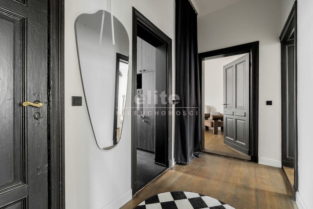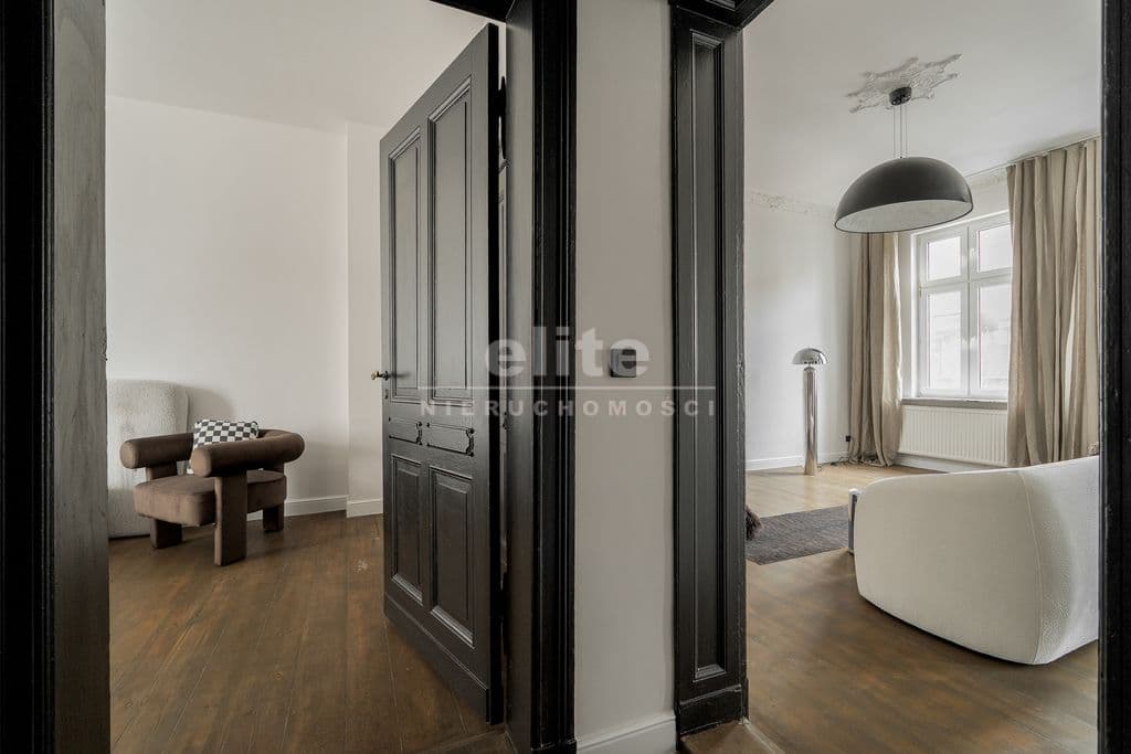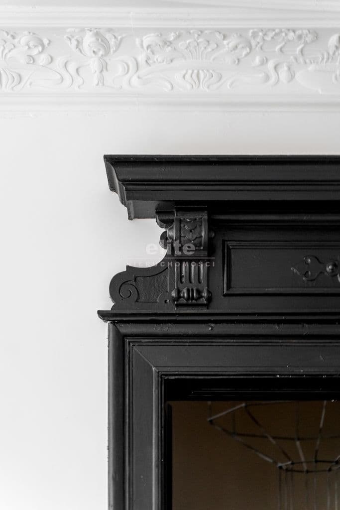 Duma mieszkania – stolarka: Największym skarbem mieszkania jest oryginalna stolarka drzwiowa, zachowana w wyjątkowej, historycznej estetyce. Drzwi zdobią klasyczne korony (gzymsy), które nadają wnętrzu unikalnej wyniosłości. Całość dopełniają oryginalne klamki, które przetrwały próbę czasu.
