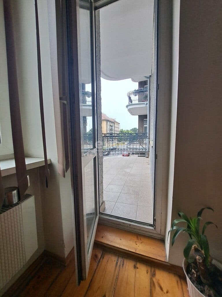 Salon z kominkiem i wyjściem na balkon, z którego rozpościera się widok na urokliwą ulicę miasta niedaleko Pl. Lotników .
