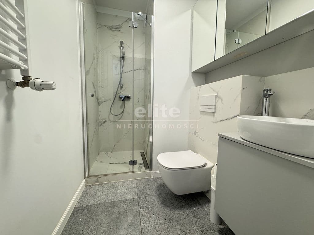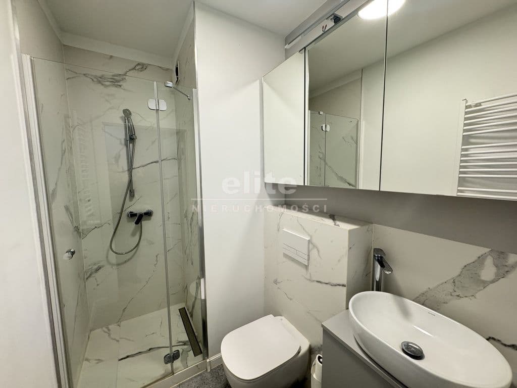 Łazienka z prysznicem, pralką.