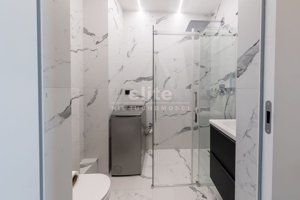 - stylowa łazienka wykończona szkliwionym gresem imitującym biały marmur, z kabiną prysznicową, umywalką, toaletą oraz nową pralką.