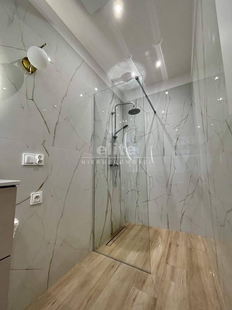 Stylowa łazienka –eleganckie kafle o dużym formacie, duży i wygodny prysznic z deszczownicą, miejsce na podłączenie pralki.