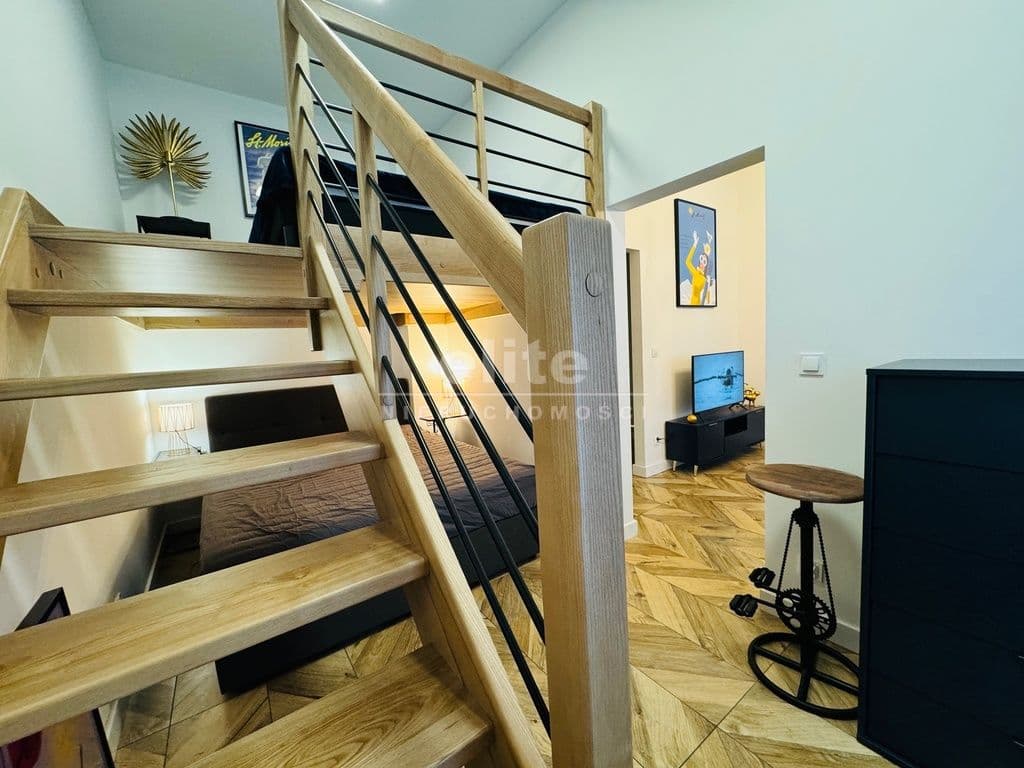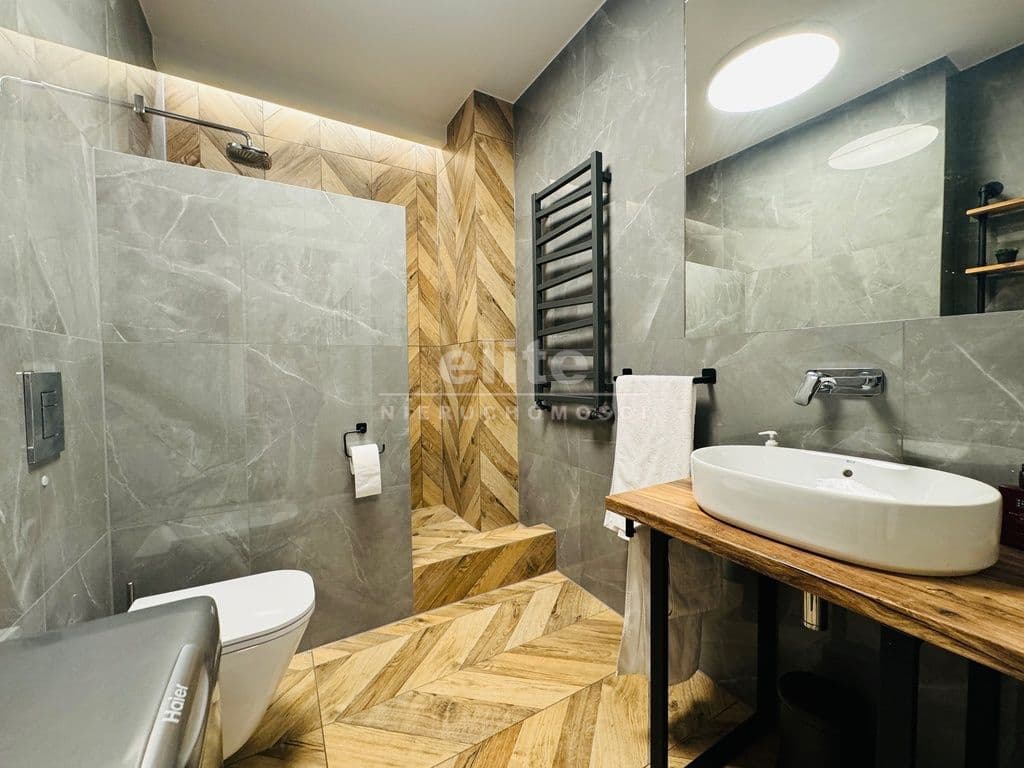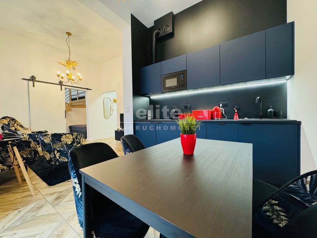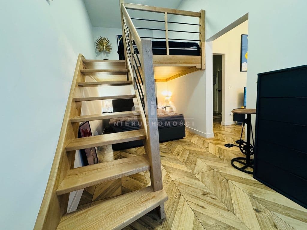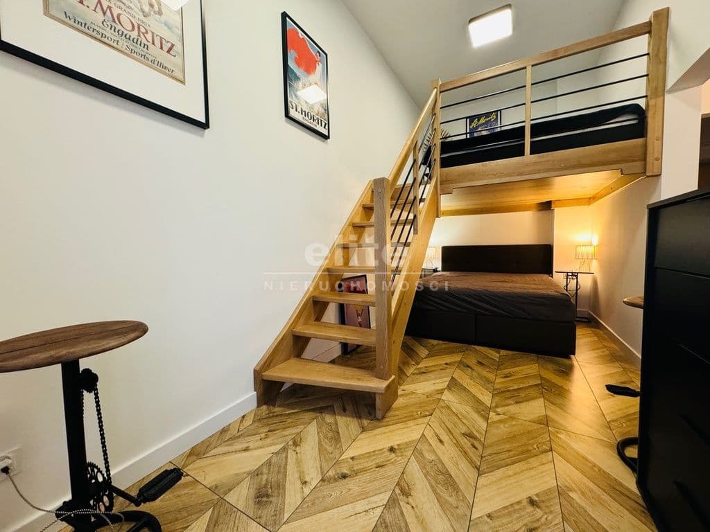 Mieszkanie wykończone wysokiej klasy materiałami, na podłodze kafle imitujące drewno, kuchnia wykonana na zamówienie. Całość urządzona bardzo elegancko i ergonomicznie. Atutem apartamentu jest dodatkowa antresola oraz przepiękny balkon z dostępem do obu pokoi.