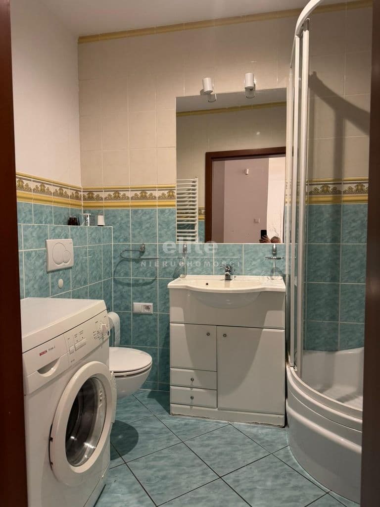 •łazienka z prysznicem, pralką oraz grzejnikiem drabinkowym