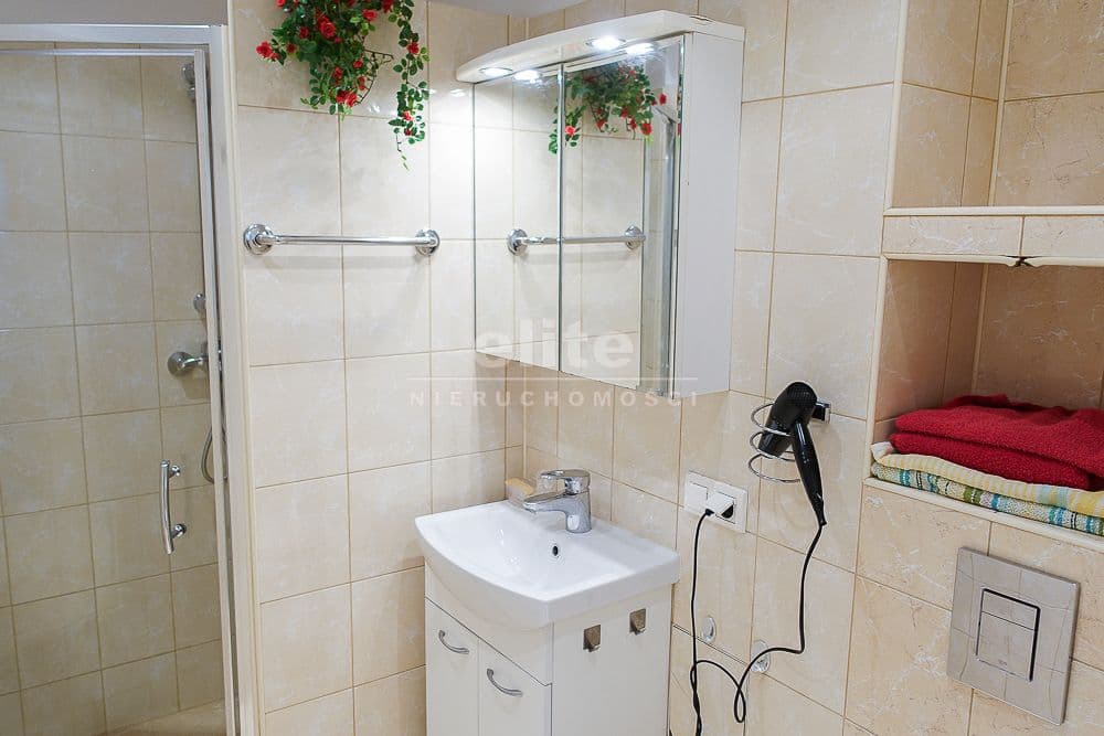 * w łazience nowa glazura i terakota, wygodny prysznic, na poziomie zerowym, umywalka i WC razem.