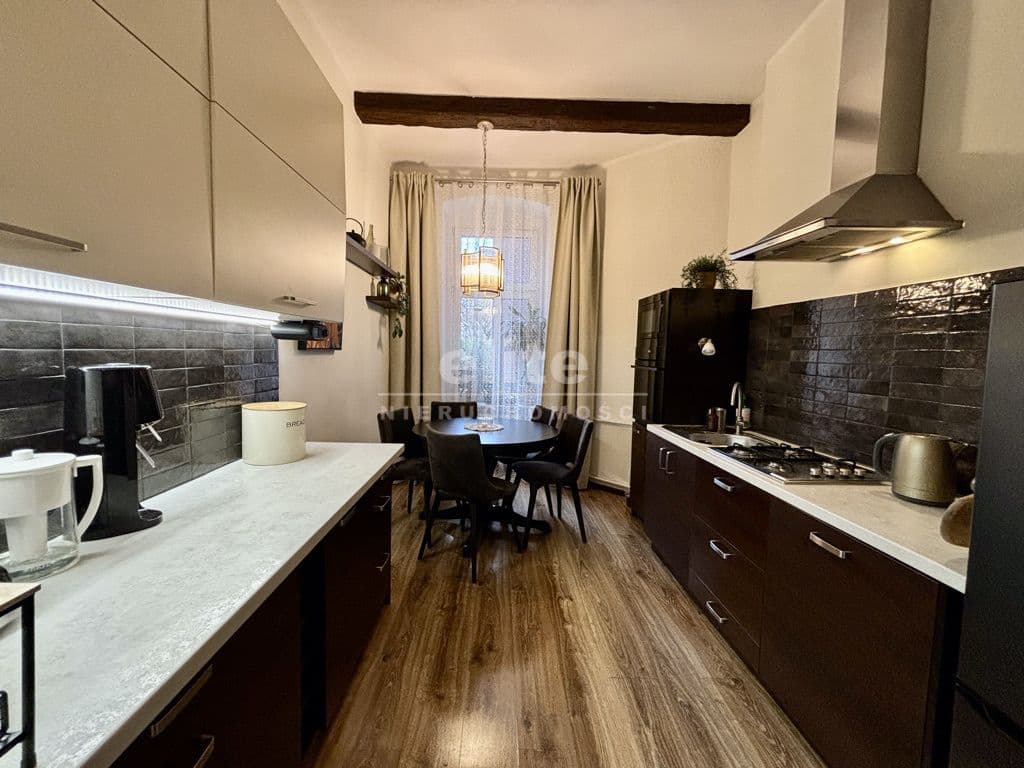 Nieruchomość jest bardzo zadbana. Na podłogach położono panele a częściowo odrestaurowano oryginalne deski, zachowano również oryginalną, starą stolarkę drzwiową, co nadaje wnętrzu unikalnego charakteru. Okna PCV, instalacja elektryczna miedziana. Do wyłącznego użytku właściciela przynależy duża piwnica umiejscowiona bezpośrednio pod mieszkaniem.