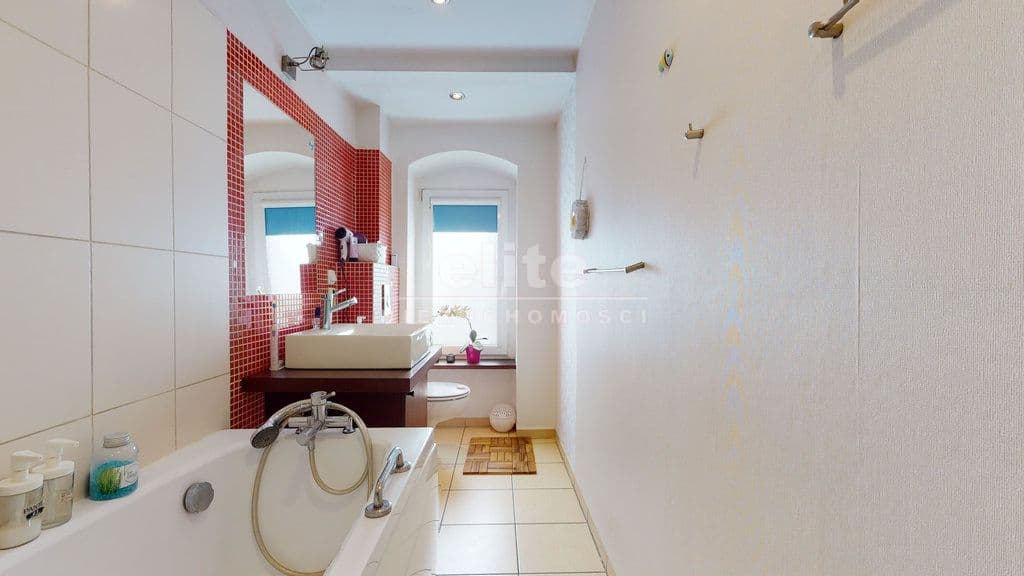- łazienka - po generalnym remoncie, z dużym oknem, położona odrobinę ponad poziomem całego mieszkania, dlatego wchodzimy do niej po oryginalnych drewnianych schodach.