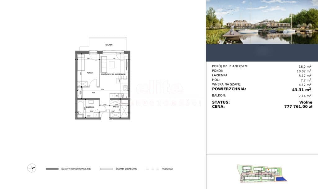 Powierzchnia lokalu wynosi 43,31 m2, stan deweloperski daje kupującemu spore możliwości aranżacyjne i dopasowanie apartamentu do swoich potrzeb oraz gustu.