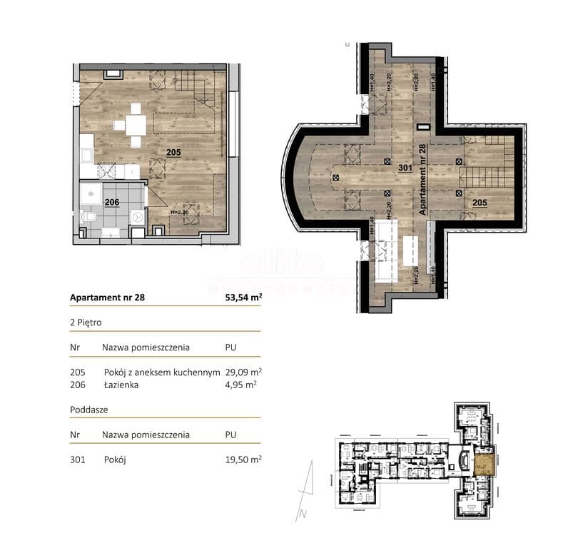 Przedmiotowe mieszkanie nr 28, 2-POZIOMOWE dwupokojowe o powierzchni 53,54mkw składa się z: