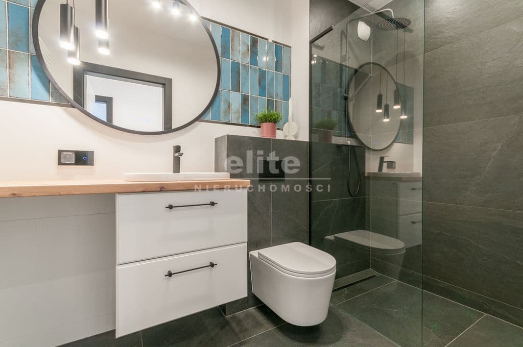 * łazienka wykończona w kaflach, z kabina prysznicową typu walk-in; zabudowany geberit, szafka z umywalką,