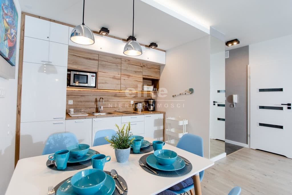 Apartament jest nowocześnie wykończony, z przestronną łazienką oraz kompletnie wyposażonym i umeblowanym aneksem kuchennym .