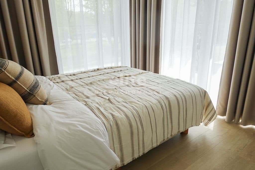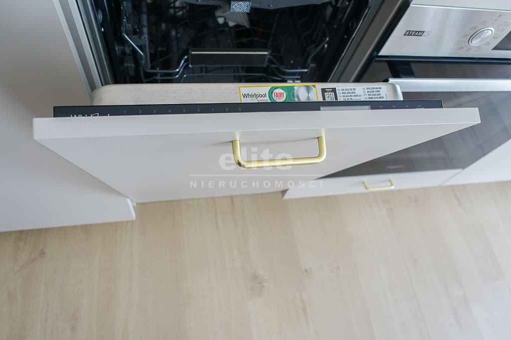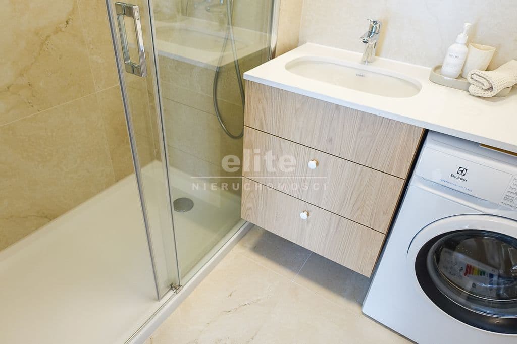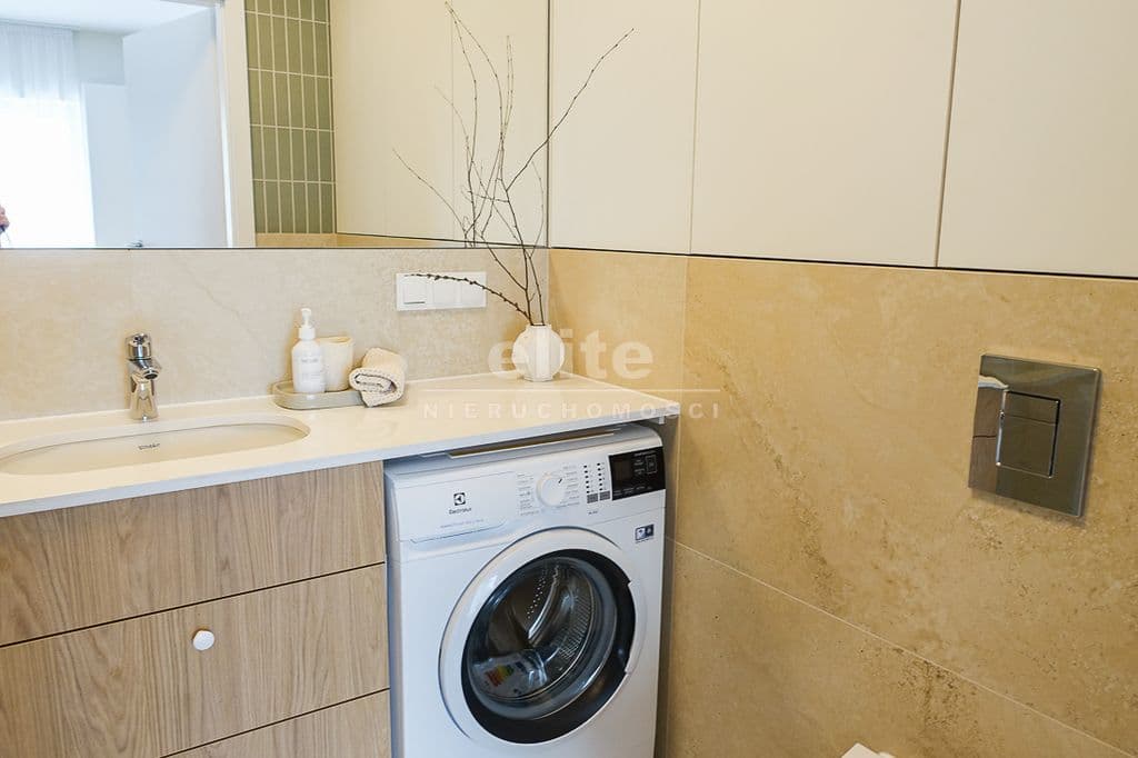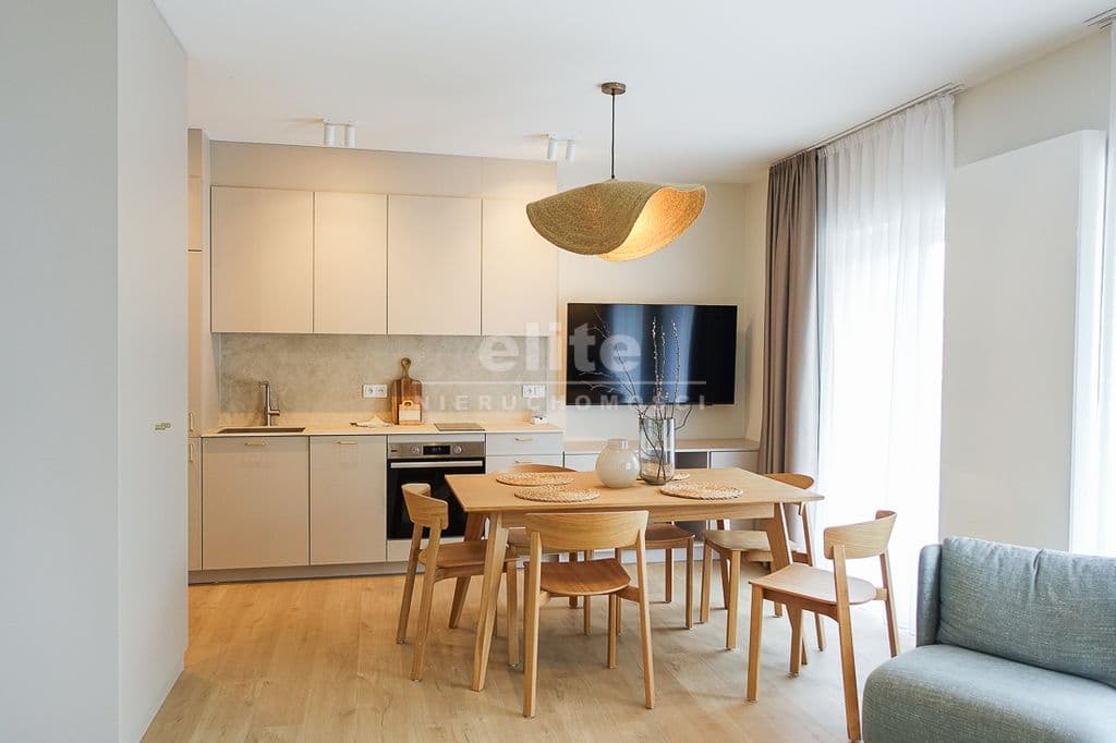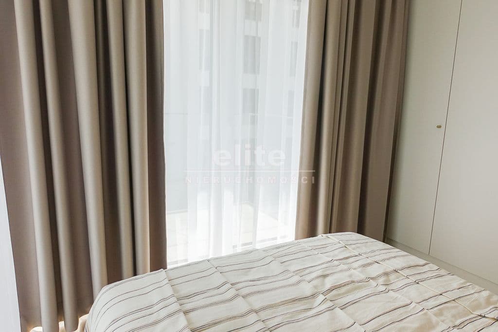 W przedpokoju szafa. W pokoju z aneksem kuchennym zabudowa kuchenna wraz z urządzeniami (zmywarka 45 cm, płyta indukcyjna, piekarnik elektryczny, zlewozmywak), wypoczynek, w łazience kabina prysznicowa, pralka, umywalka, 2 umeblowane sypialnie z szerokimi łóżkami i szafami. Z pokoju i sypialni wyjście na taras od strony południowej i zachodniej.