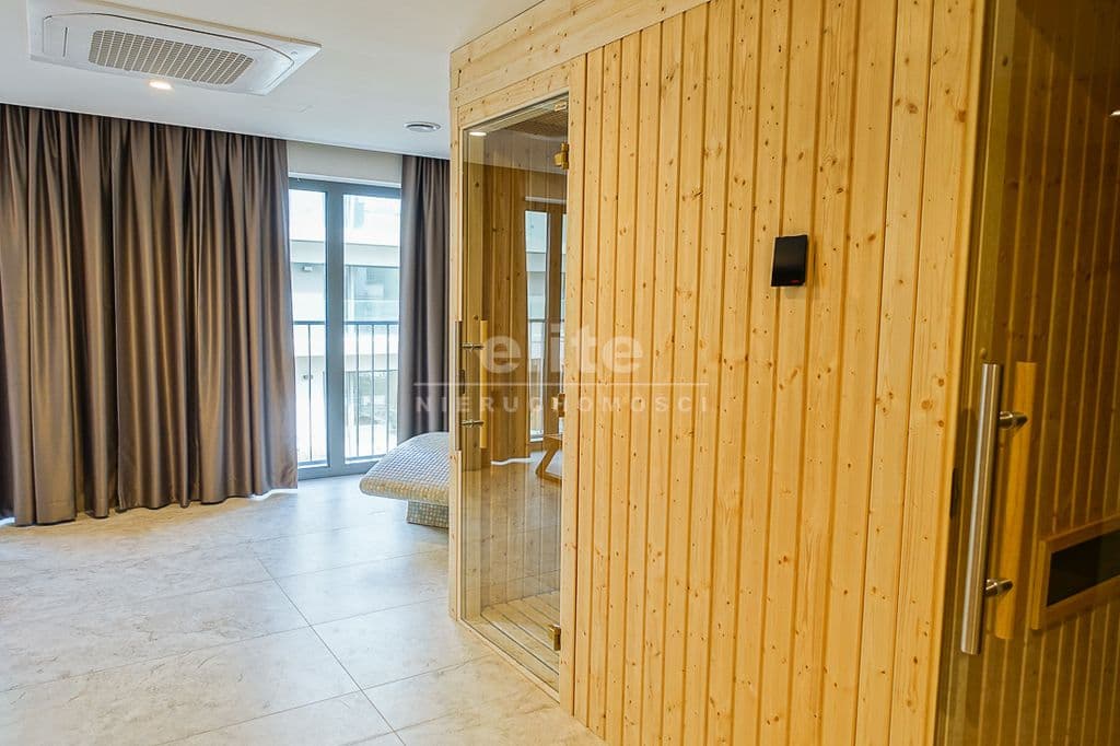 Luksusowe apartamenty na ostatniej kondygnacji dodatkowo posiadają wyjścia na indywidualne tarasy na dachu budynku. W obiekcie jest sucha sauna, grota solna, siłownia i Kidsclub. Mieszkanie jest już dostępne. Zainstalowana klimatyzacja i możliwość zdalnego sterowania, rolety antywłamaniowe są wykonane, bramy garażowe otwierane pilotem, teren zamknięty.