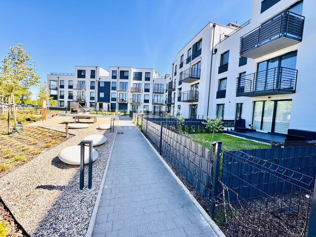 Osiedle z liczną roślinnością, placem zabaw, sklepem "Żabka", oraz miejscami parkingowymi.