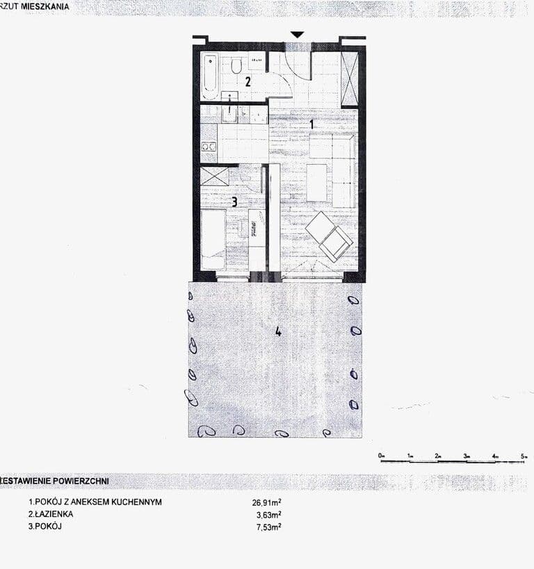 Na powierzchnię mieszkania składają się salon z aneksem kuchennym (typu: "open space") oraz wyjściem na taras, łazienka z WC.