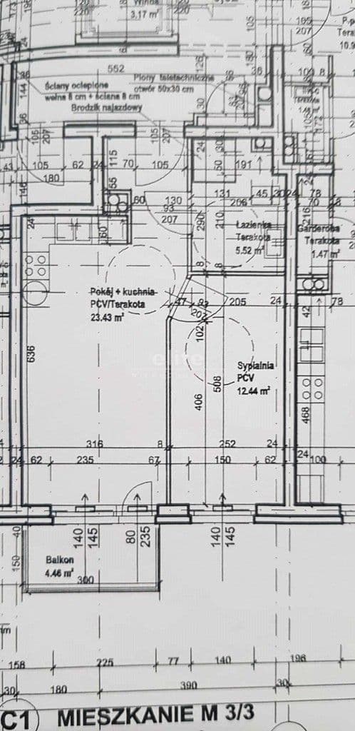 - salon z aneksem kuchennym ( 23,43 m2 ) z wyjściem na balkon ( 4,46 m2 ) od strony zachodniej,