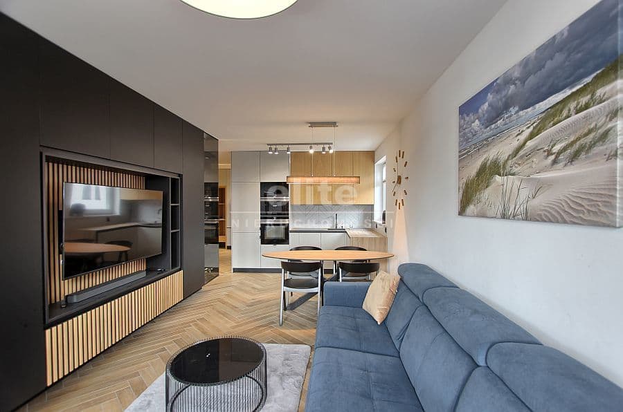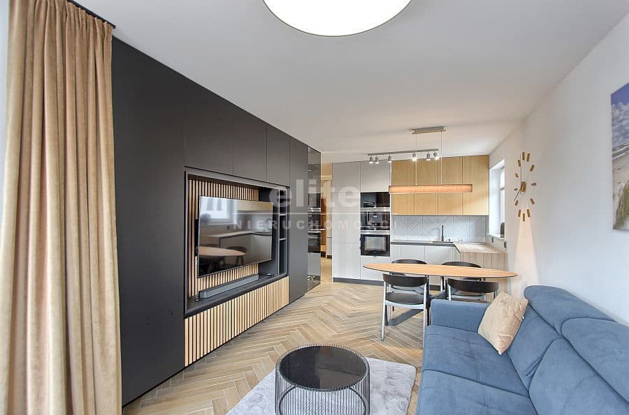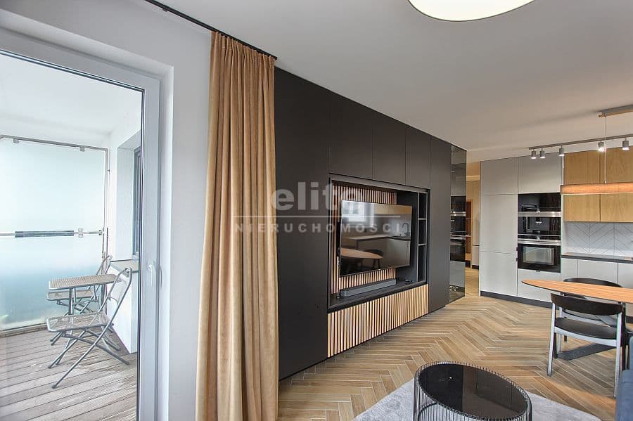 1. W pełni umeblowany salon z aneksem kuchennym oraz wyjściem na balkon.