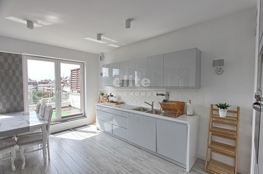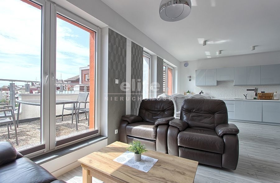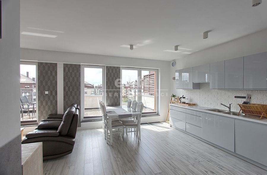 - Przestronny salon z otwartą kuchnią: Stylowo urządzony salon z bezpośrednim wyjściem na duży balkon oraz otwartą kuchnią, wyposażoną w nowoczesny sprzęt AGD.