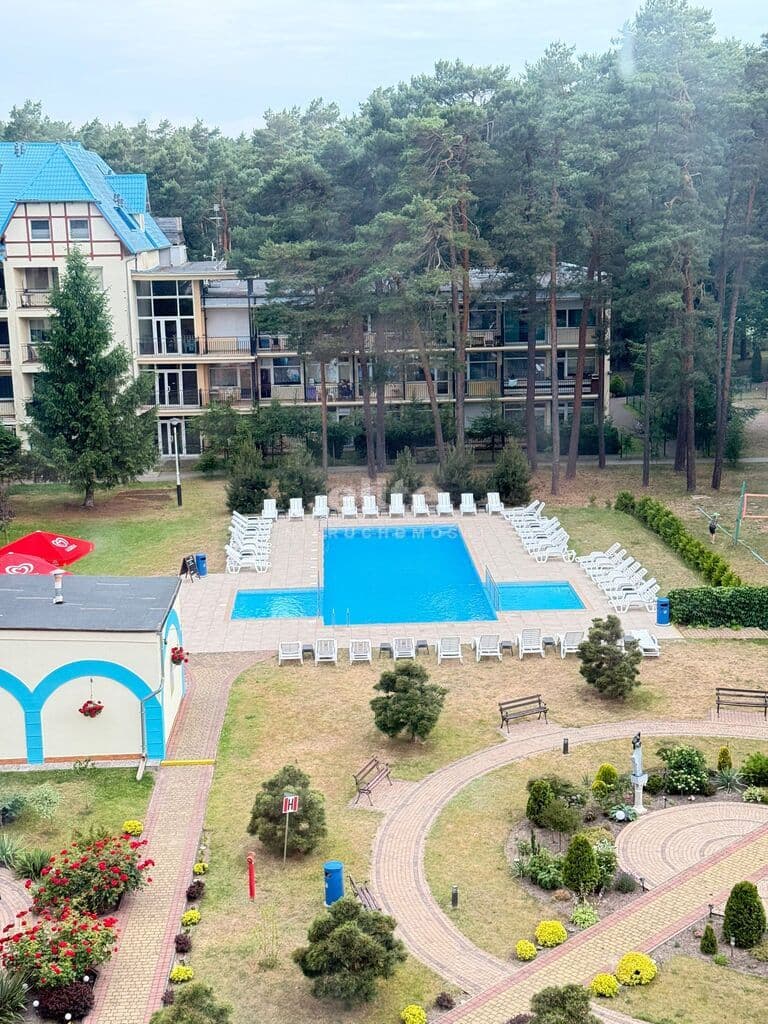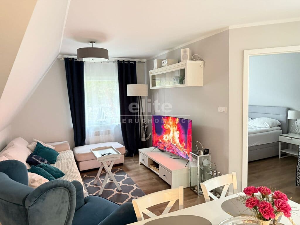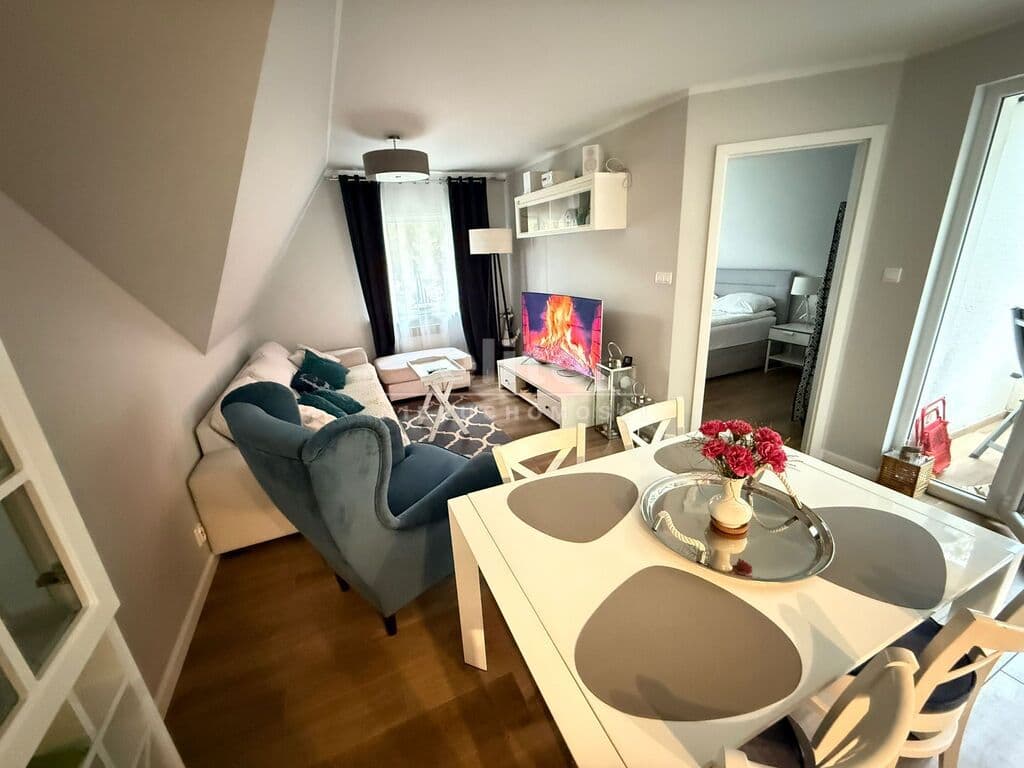Na I poziomie hol, łazienka, duży pokój połączony z aneksem kuchennym oraz zamykana oddzielna sypialnia. Balkon z widokiem na las iglasty.