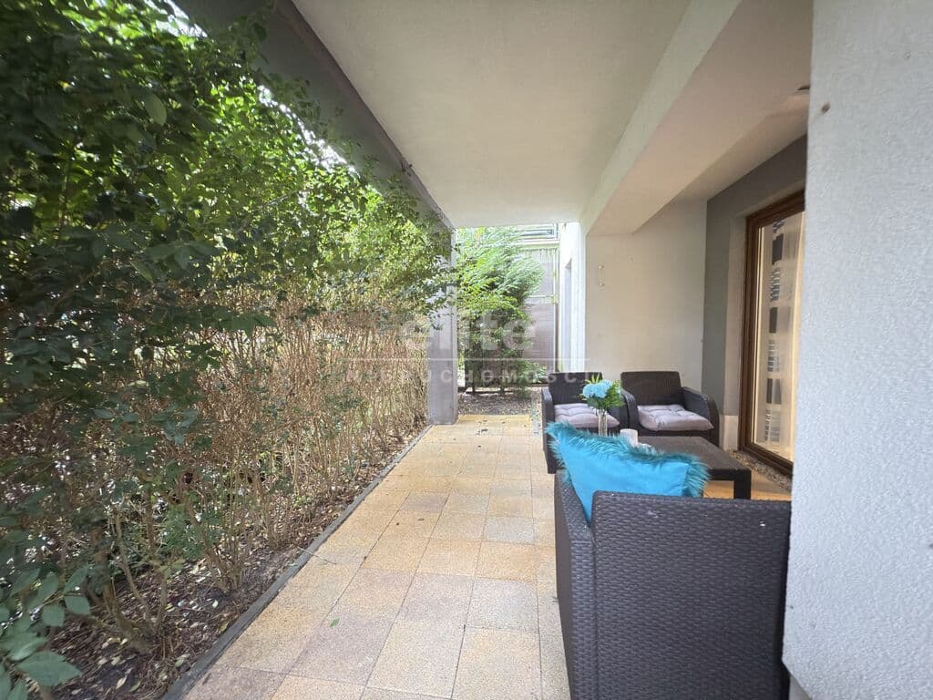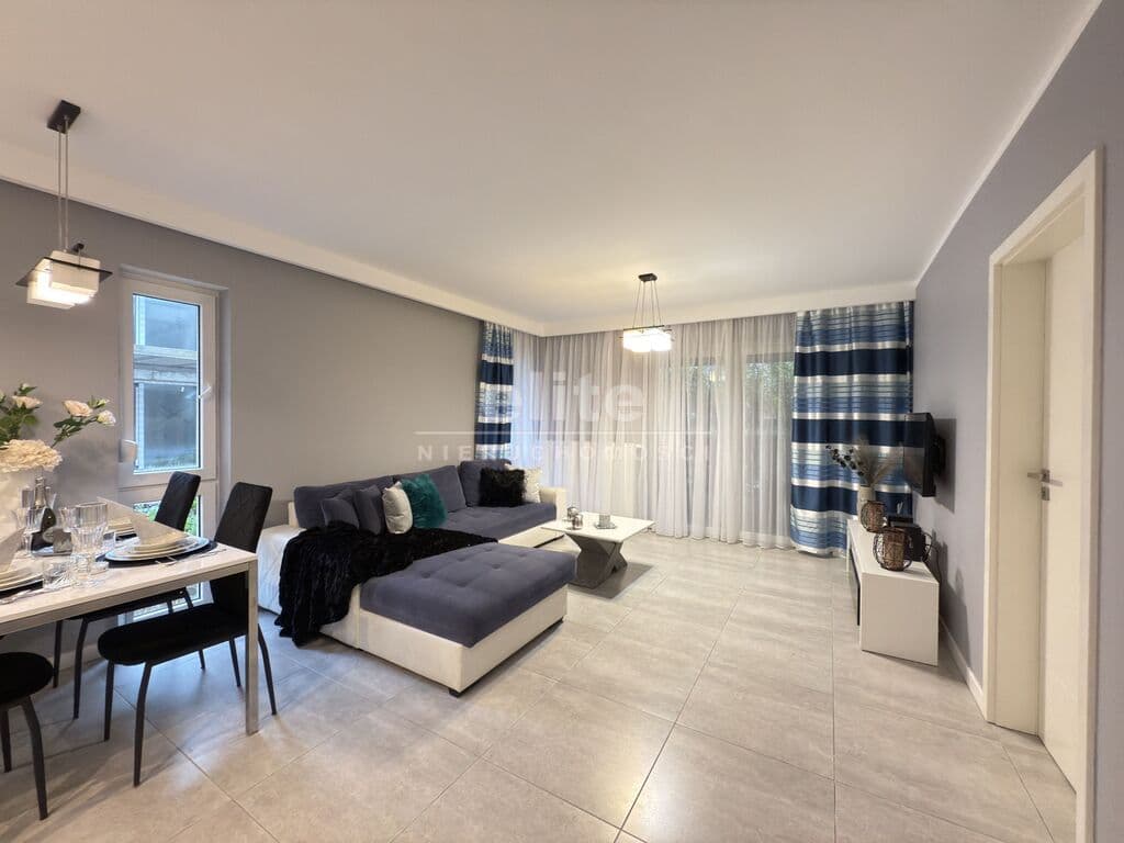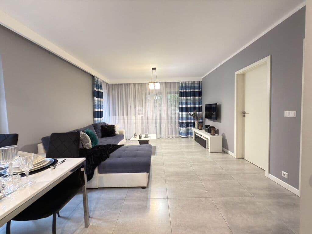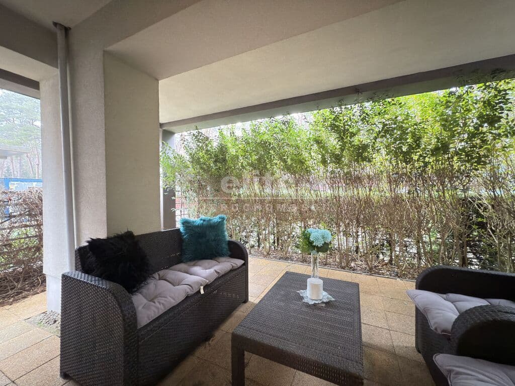 Wyjątkowy apartament z prywatnym ogrodem i widokiem na zieleń, położony w eleganckim budynku zaledwie kilka minut spacerem od morza.